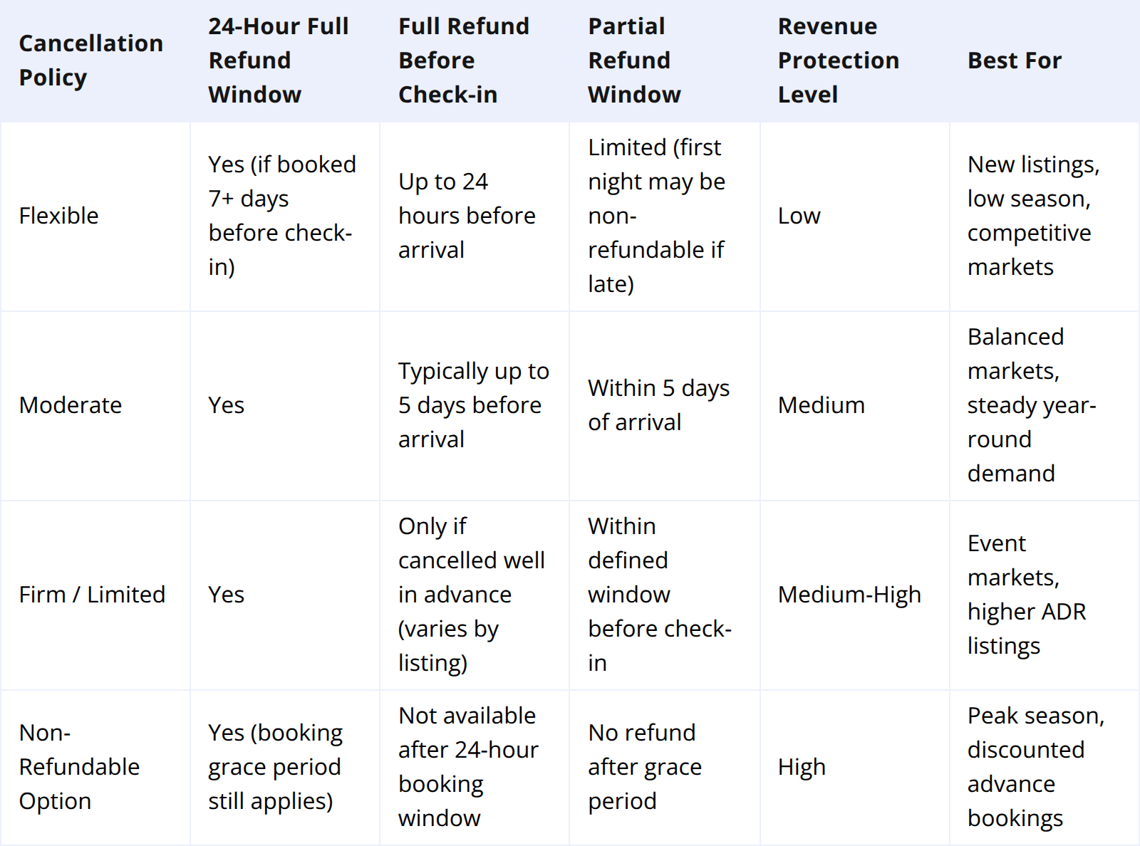Choosing a policy that matches your market, listing type, and seasonality is critical to balancing occupancy and income.