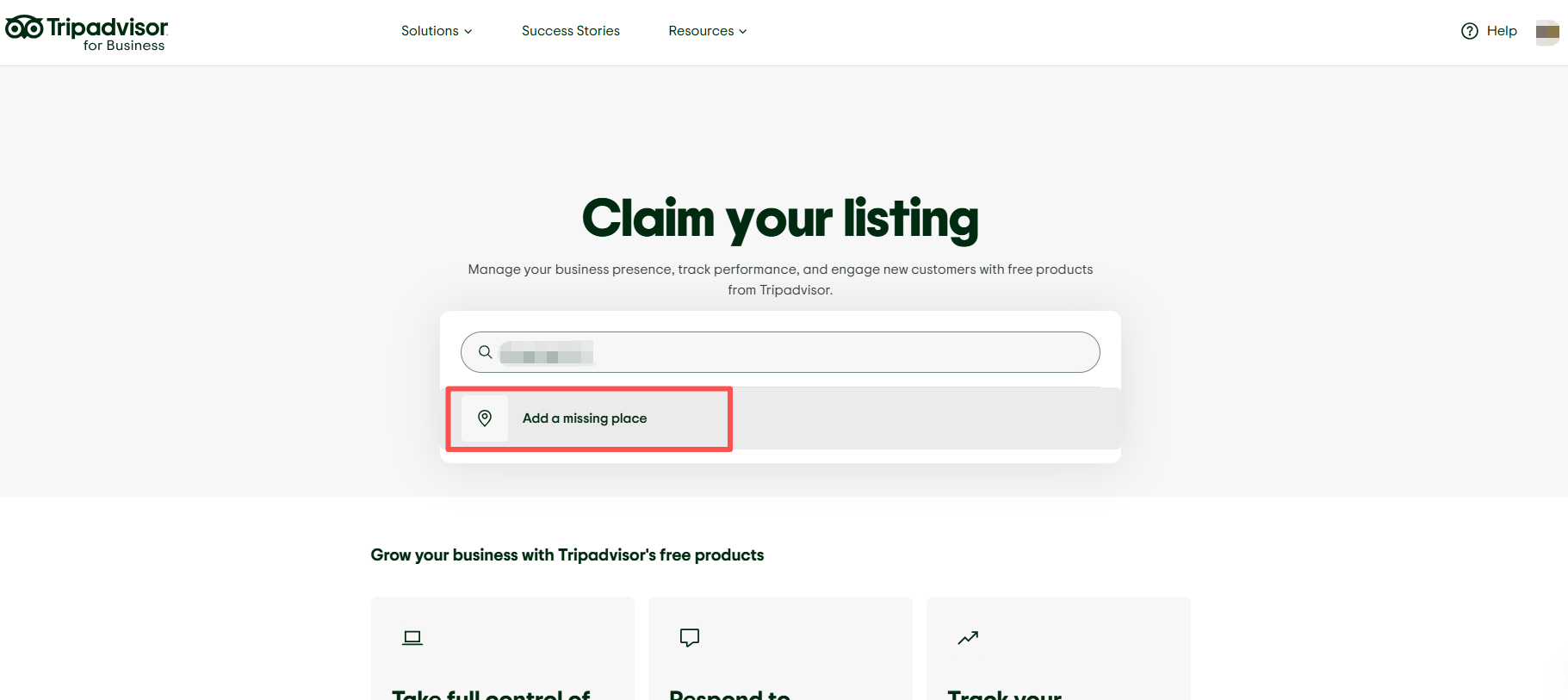 If no listing exists: Click "Add a missing place" and select your business category. TripAdvisor will ask you to confirm that your business meets their listing criteria before you proceed.