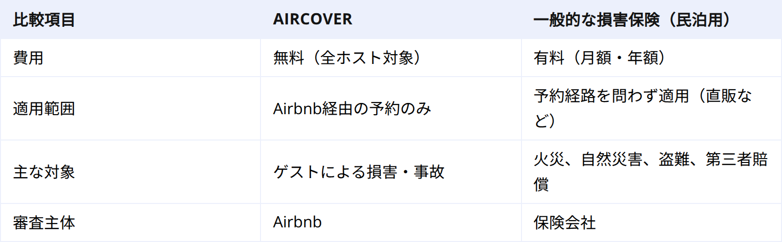 ここが非常に重要なポイントです。AirCoverは、個人の住宅保険や民泊専用保険の代わりになるものではありません。