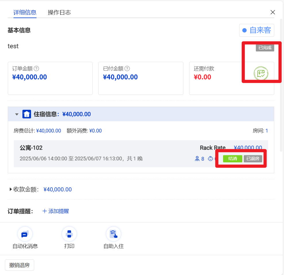 退房后,订单会显示退房状态色(默认灰色)、结清/未结清、已退房标志