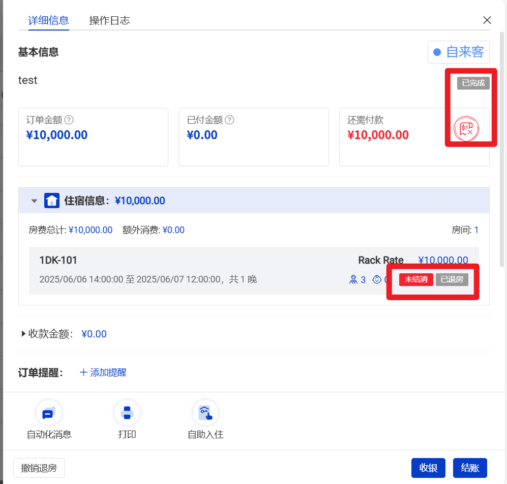 选择【结账退房】,即补录收银后退房,未付款金额清零