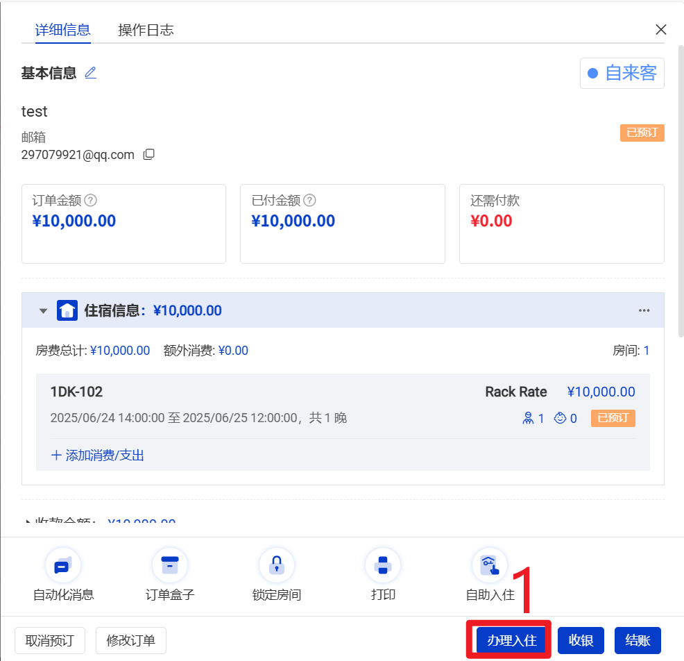 如果是录入的当日订单,可在录订单的时候操作【直接入住】