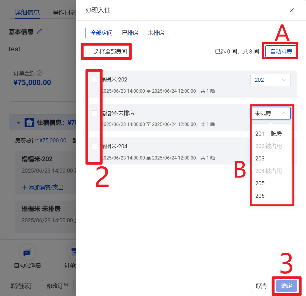 2 全选或勾选入住的房间。如果有未排房或调房需求,可点击A 自动排房或 B 调整入住房间/手动排房