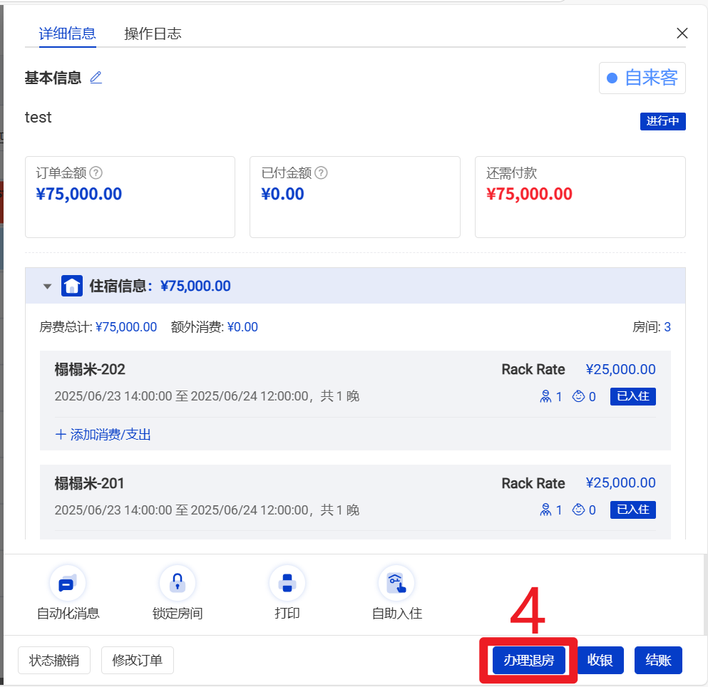 4 点击订单的 办理退房