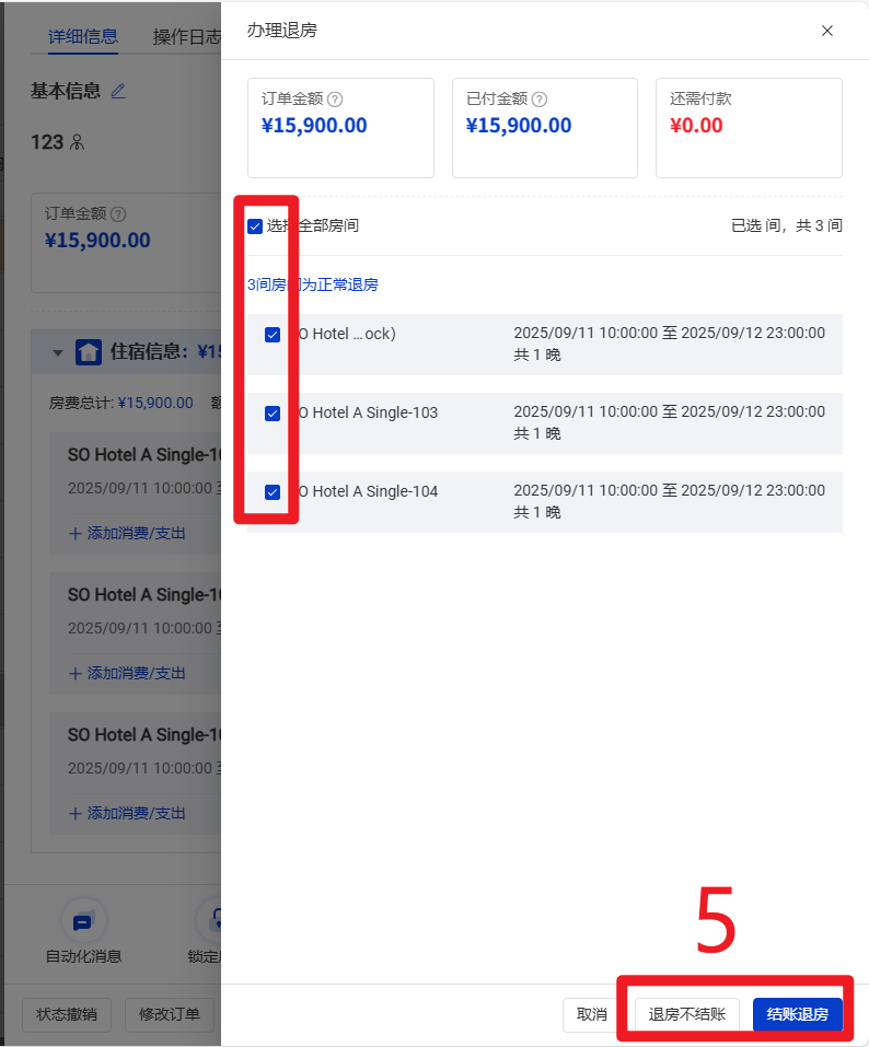 5 选择【退房不结账】,即暂不补录收银状态直接退房,未付款金额不清零。
