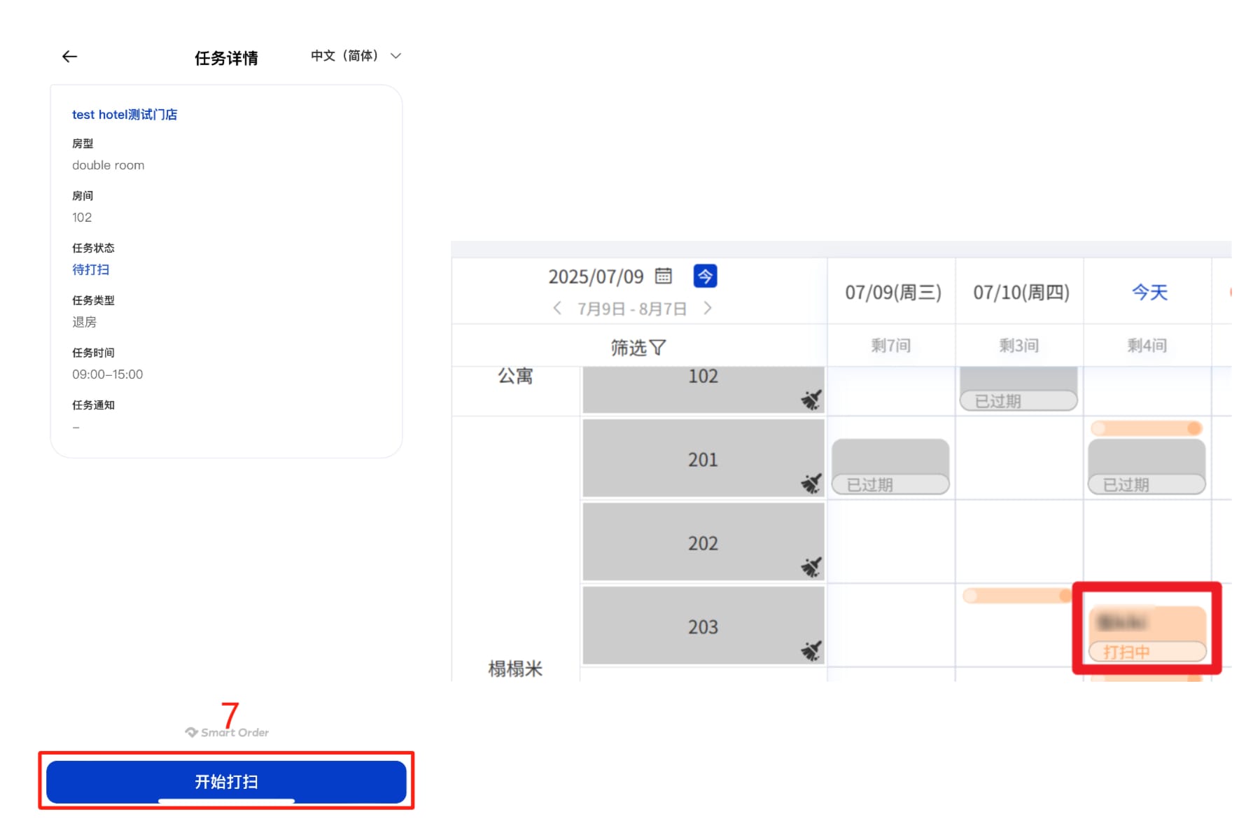 ⑦在任务当天,保洁员在网页上点击“开始打扫“。此时,保洁任务会变成“打扫中
