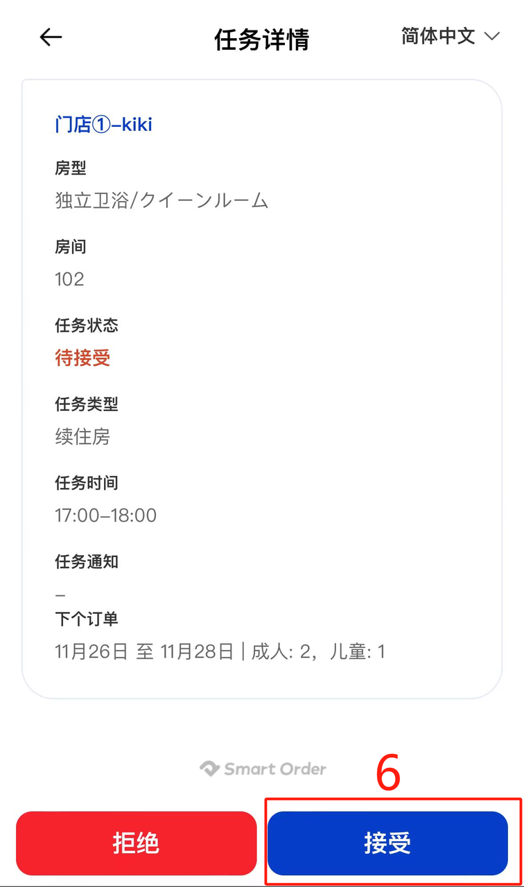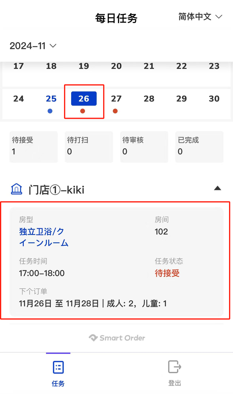 ⑥该任务会变成“待接受“状态后,需要保洁员登录https://www.smartorder.jp/housekeeping/,找到对应的任务,点击接受