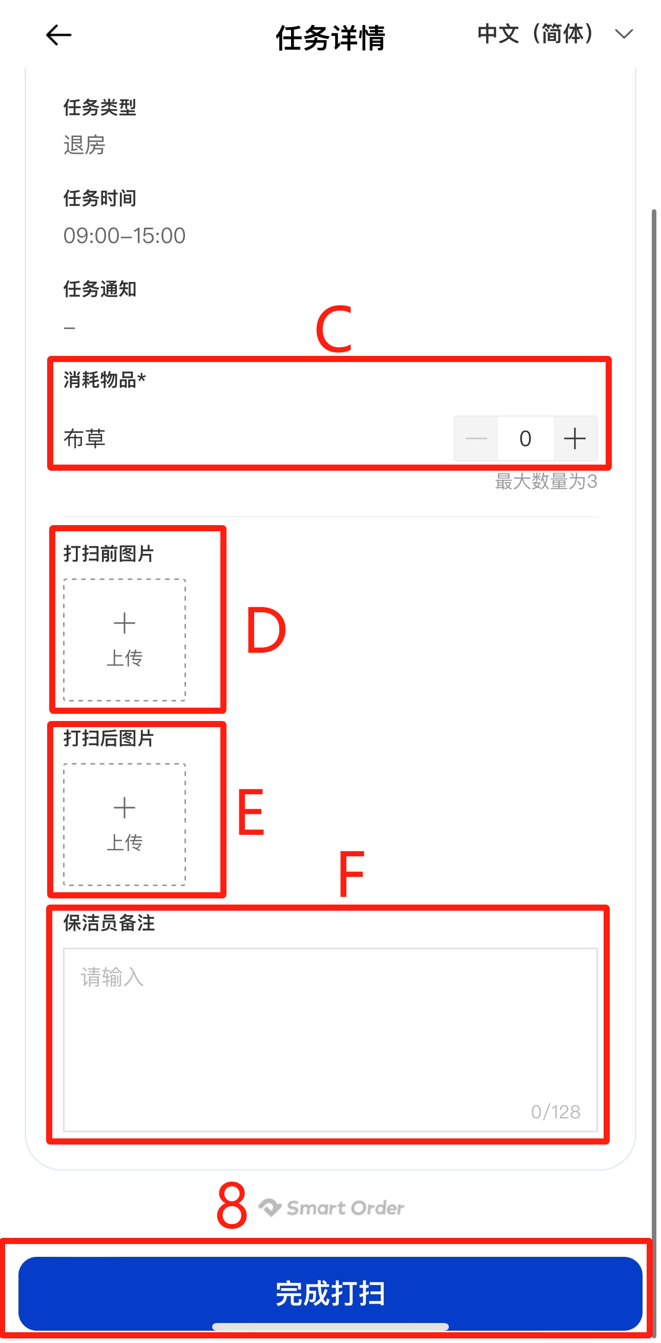 ⑧ 保洁员在网页上添加好易耗品,上传好图片以及完成备注之后,点击完成打扫