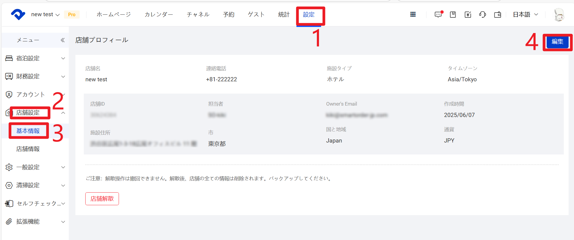 操作パス:設定 → 店舗設定 → 基本情報/店舗詳細 → 編集