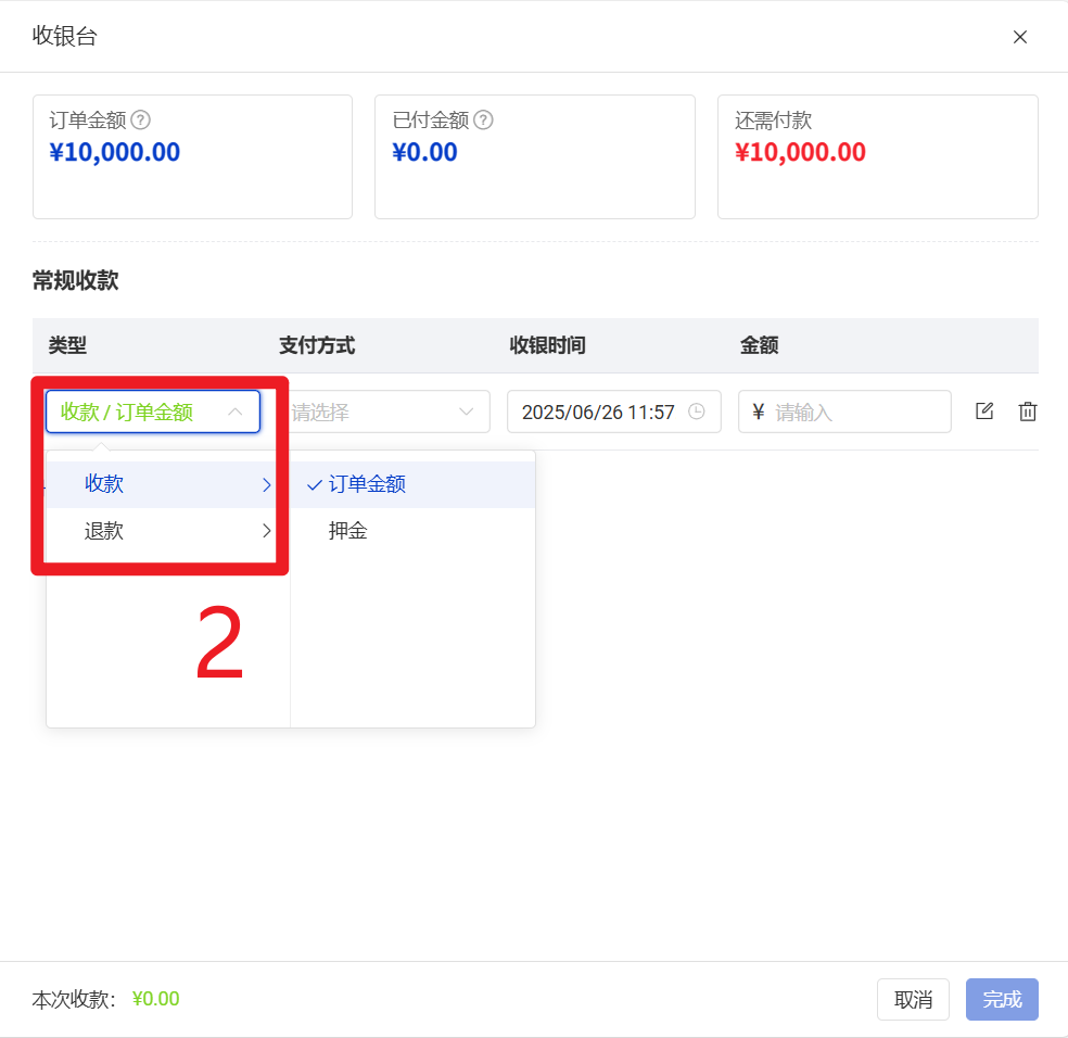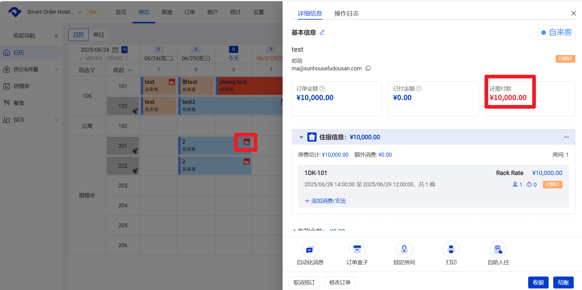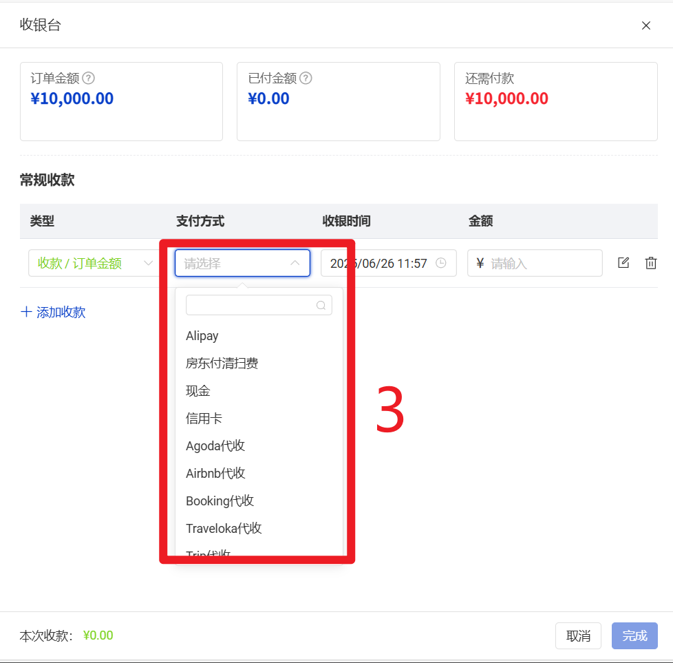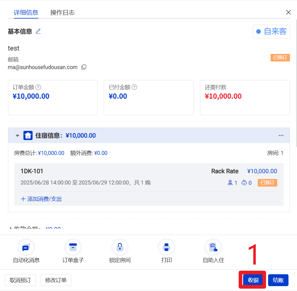 例如记录房费、额外消费的收银/退款。系统内未平账订单右上角带有红色标志,可以对这类订单操作增加收银/退款记录,让订单平账。