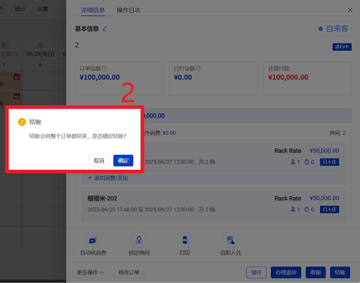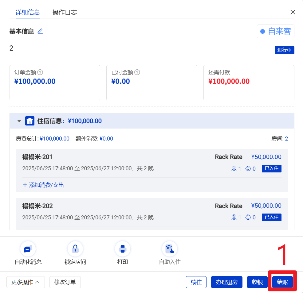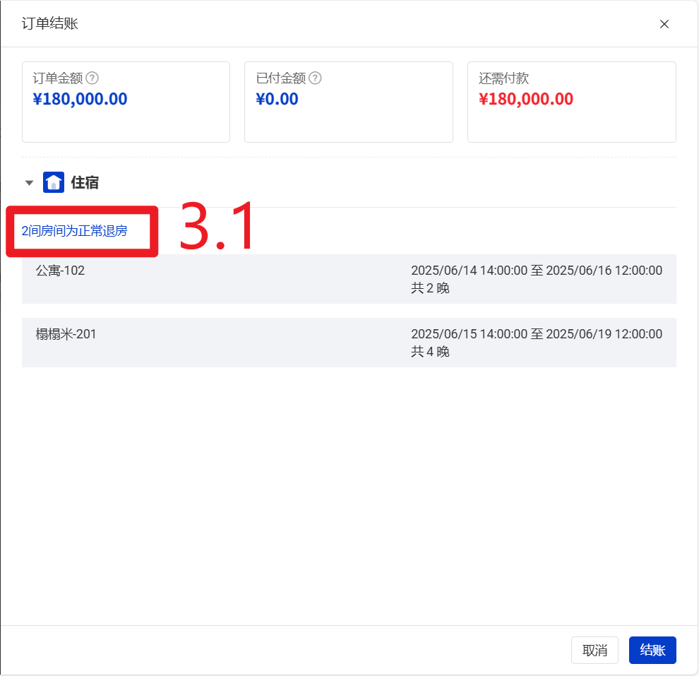 ※只有当订单已办理入住才可操作结账。例如当订单已确认入住和退房后核算整笔订单金额可点击结账,确认结束整笔订单。