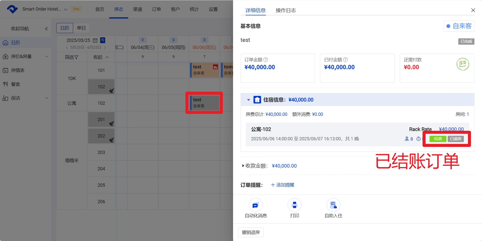 结账后日历上订单会自动显示退房状态色(默认灰色)