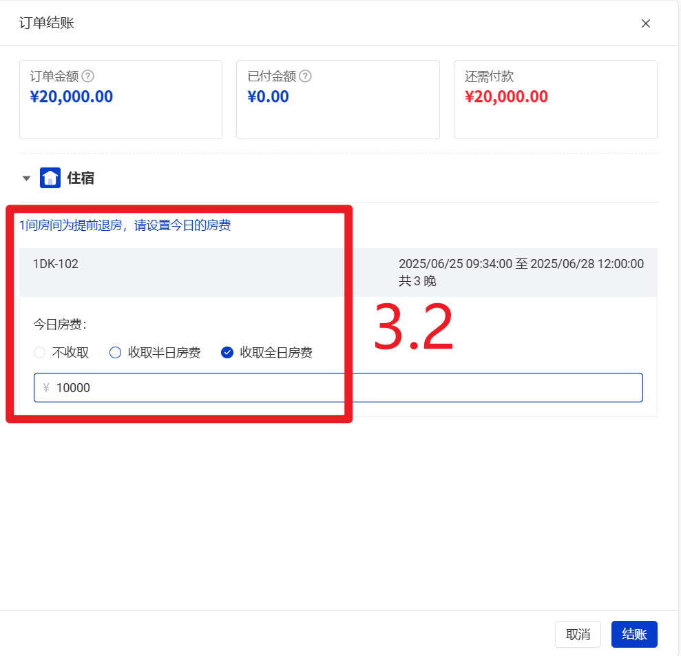 3.1 提前退房:需选择房费收取方式,确认收取金额后退房