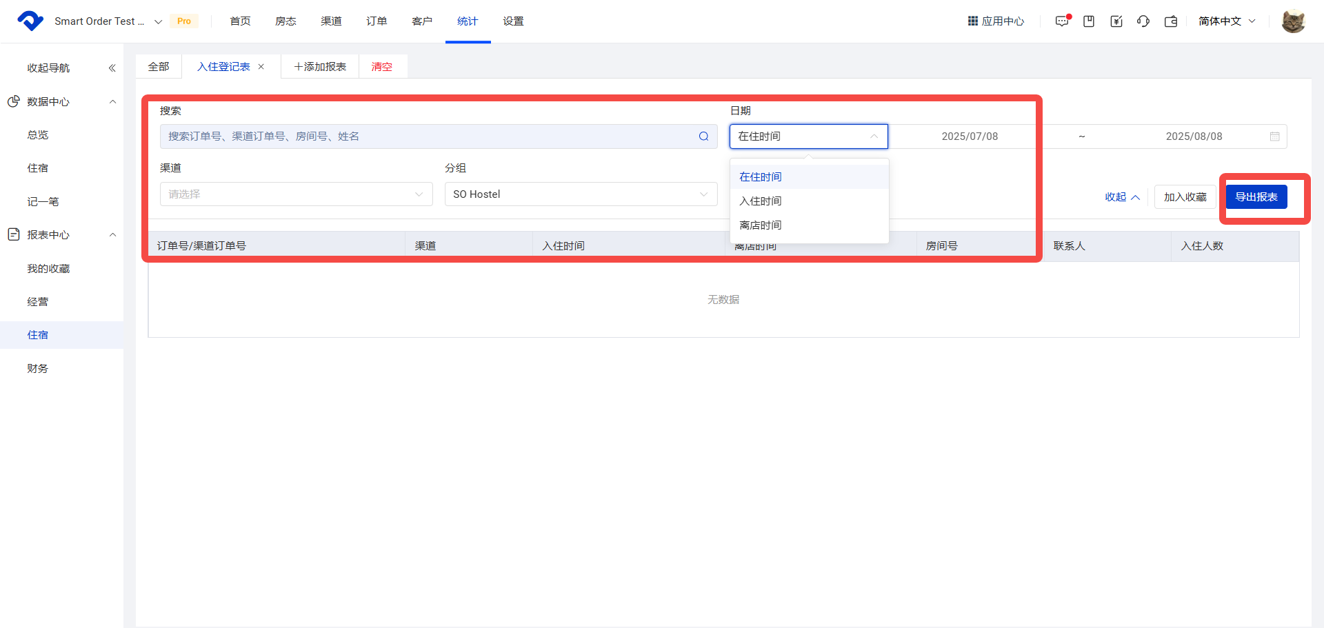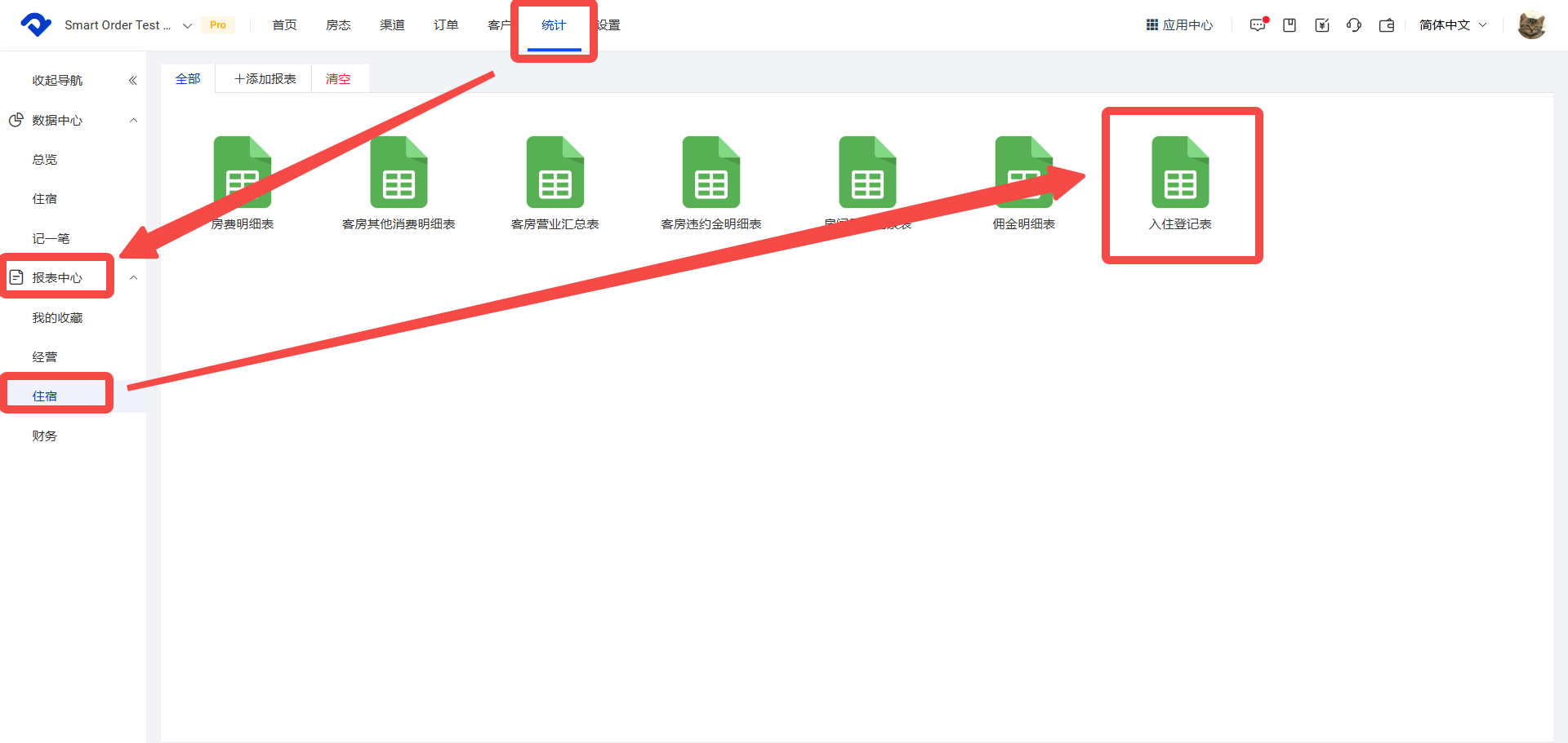 1.在系统顶部菜单进入【统计】-【报表中心】-【住宿】页面。