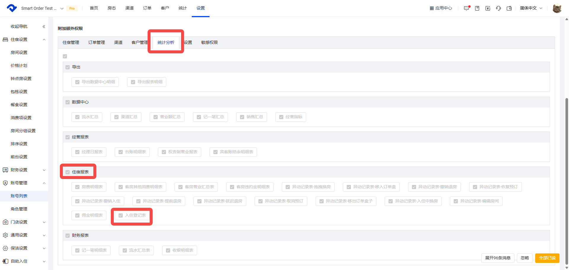 2.为需要使用此功能的账号勾选【入住登记表】权限。