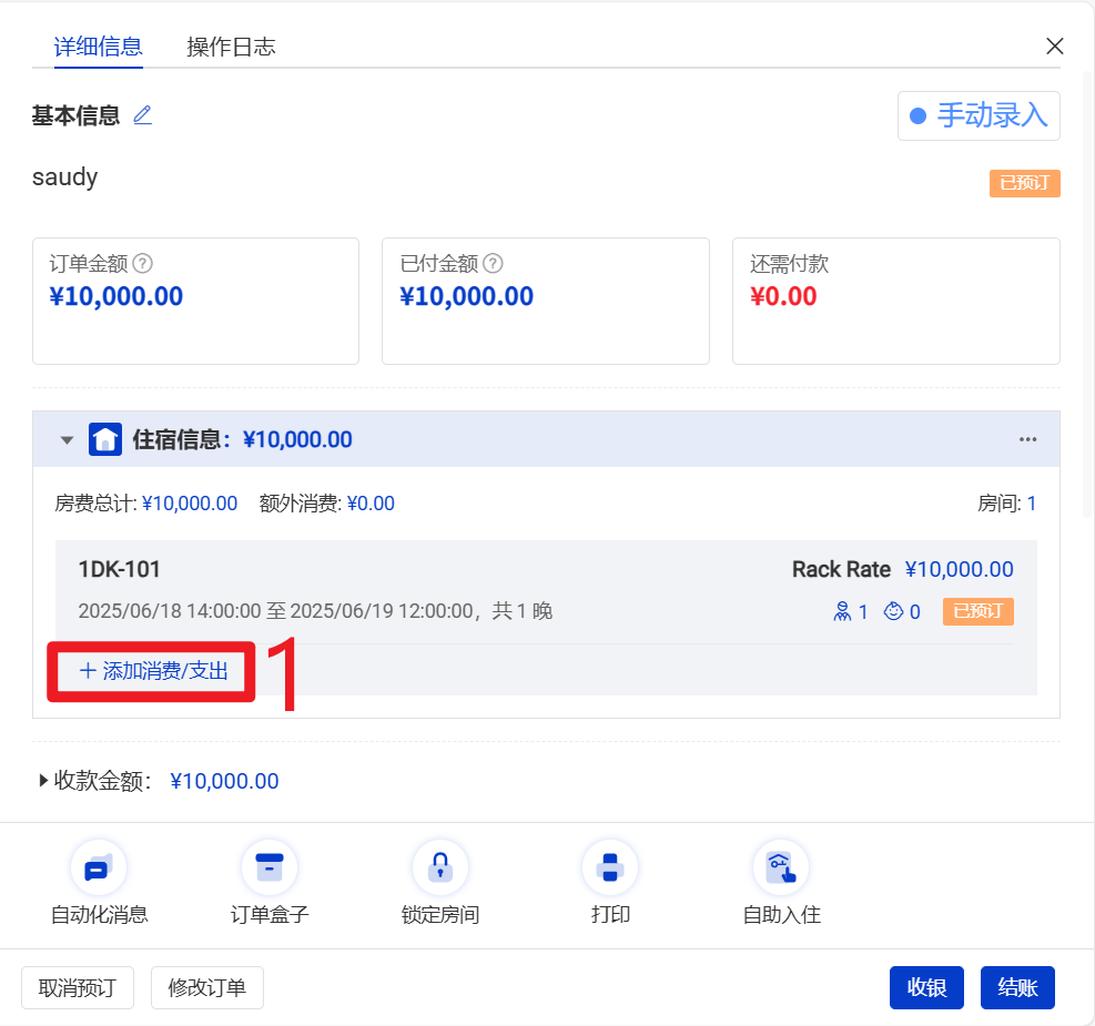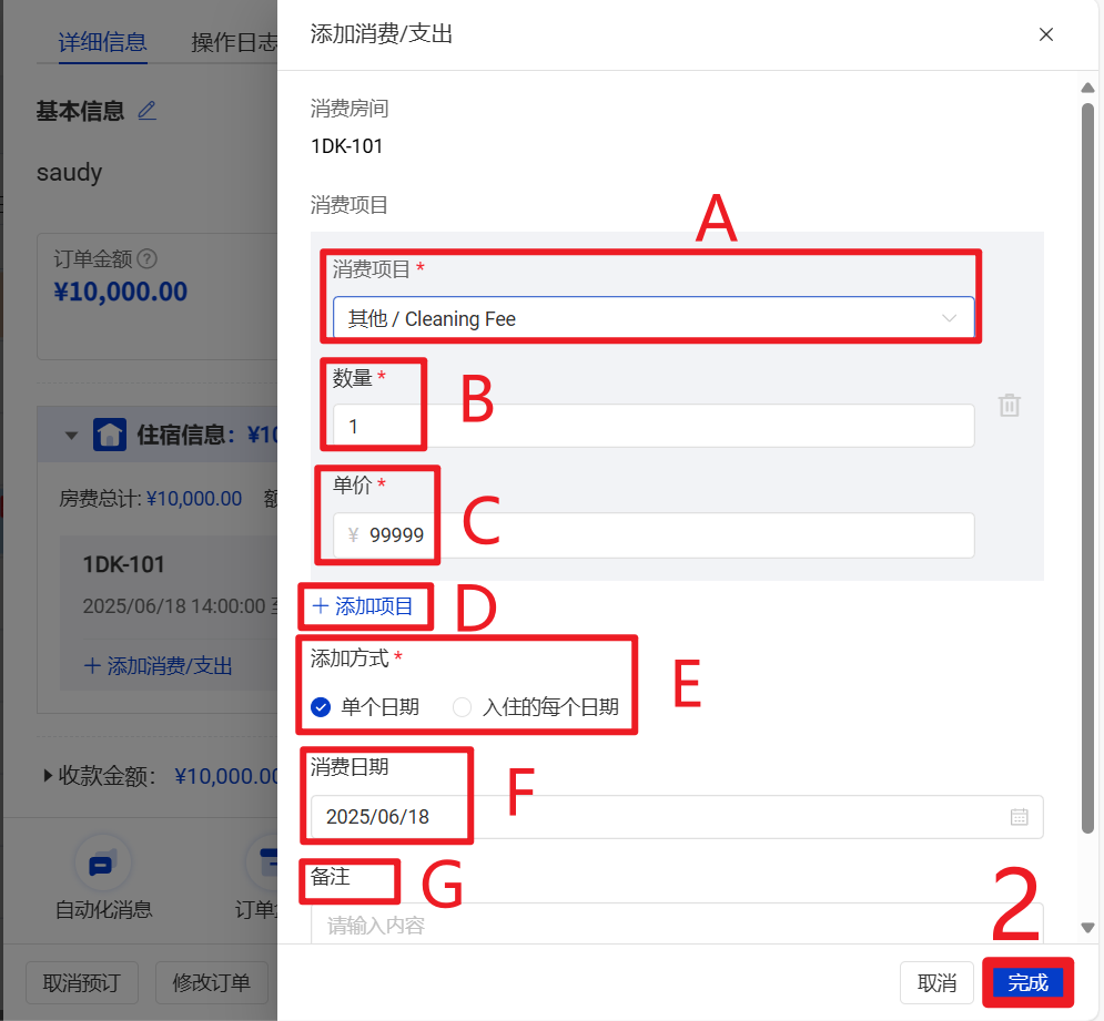 C单价 给订单添加额外消费(如清扫费)请参考文章【给订单添加、删除餐食/额外消费】 给订单添加、删除餐食/额外消费参考文章【消费项设置】设置好消费项之后,可以在订单中添加相应的消费项 操作路径:房态-选择订单-添加消费项 1 点开订单里的【添加消费/支出】 2确认好以下信息 点击【完成】 A消费项目 B数量 C单价 D可以再添加其他项目 E添加方式:只有一笔消费选【单个日期】。入住期间每天都收取选【入住的每个日期】 F消费日期 G备注ヘルプセンターK