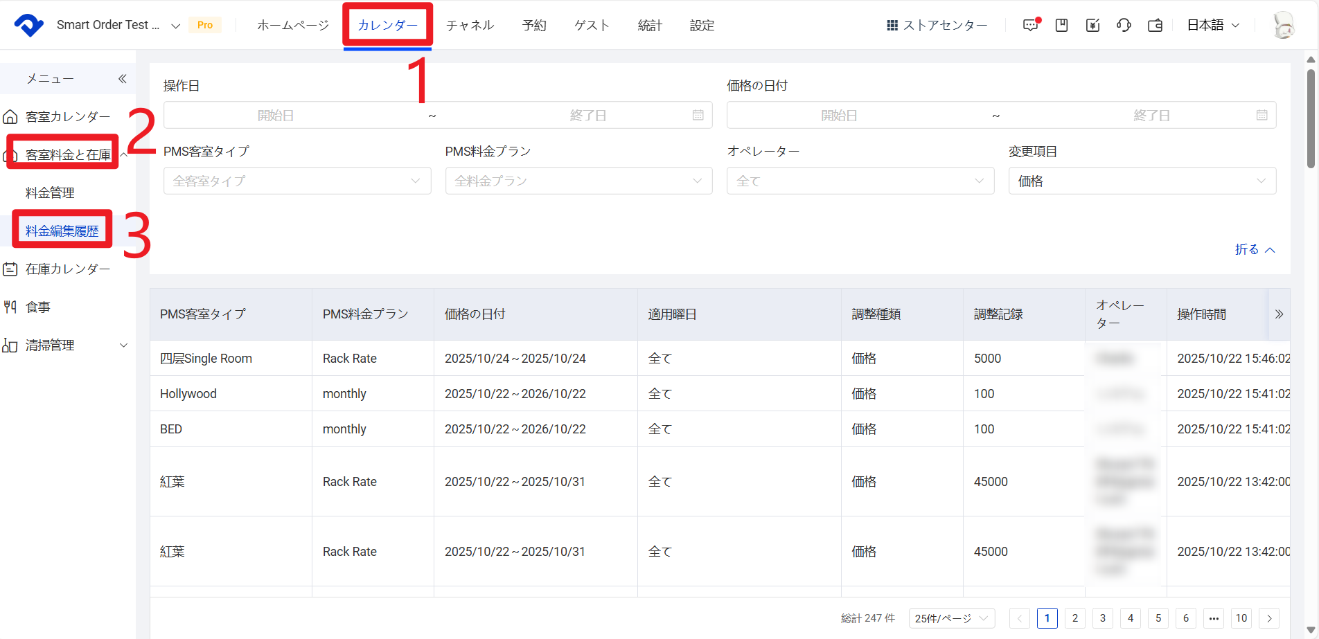変更の操作日、変更された日付、客室タイプ、PMS料金プラン、オペレーター、変更項目でフィルタリングができます