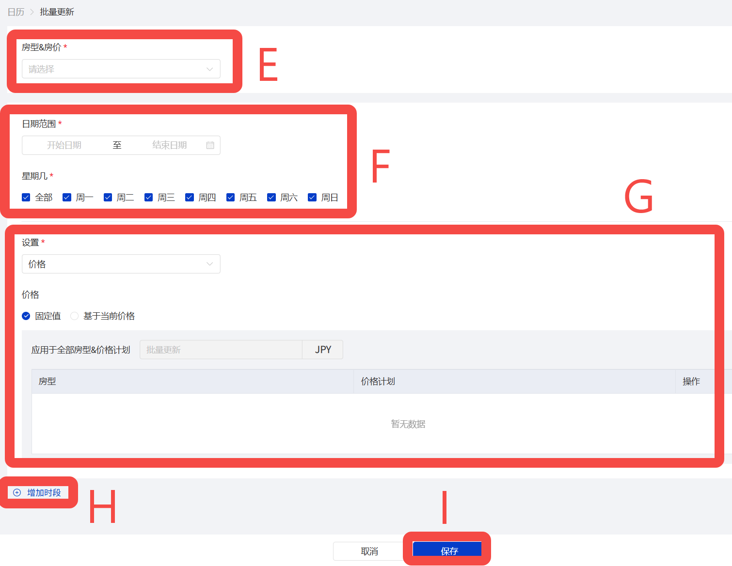 F 选择日期范围和星期几(通过增设时间段设置平日价和周末价)
