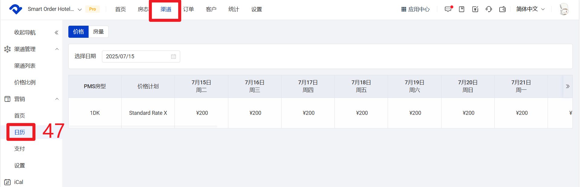 47 回到【渠道】-【营销】-【日历预览】,查看右侧日历房型、价格计划、房价