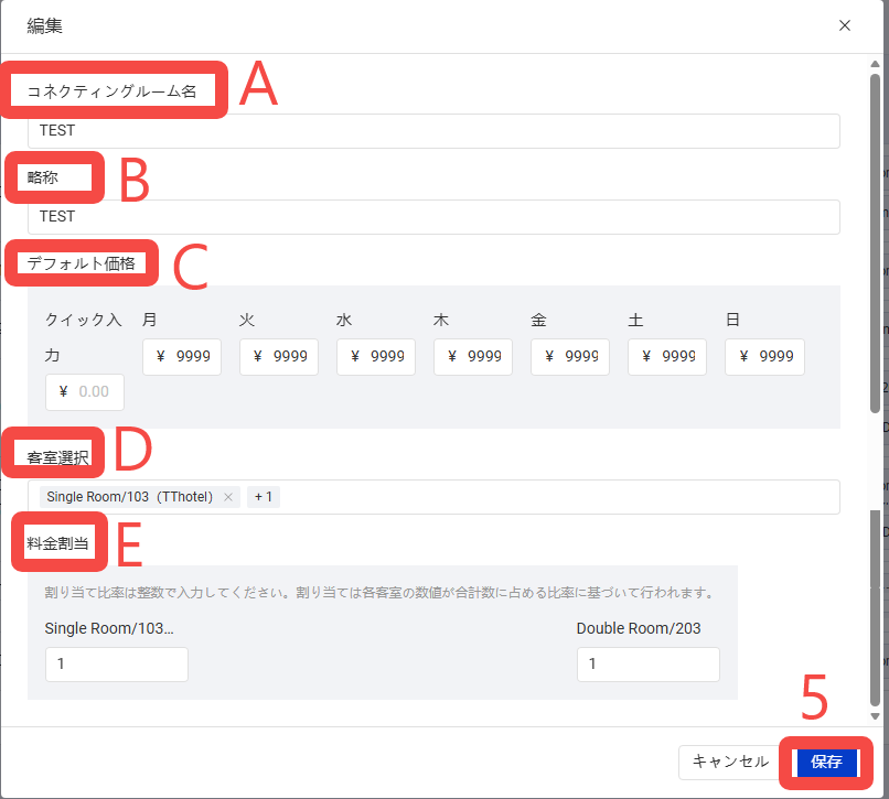 E. 料金割当:各部屋の料金配分比率を整数で入力します。
