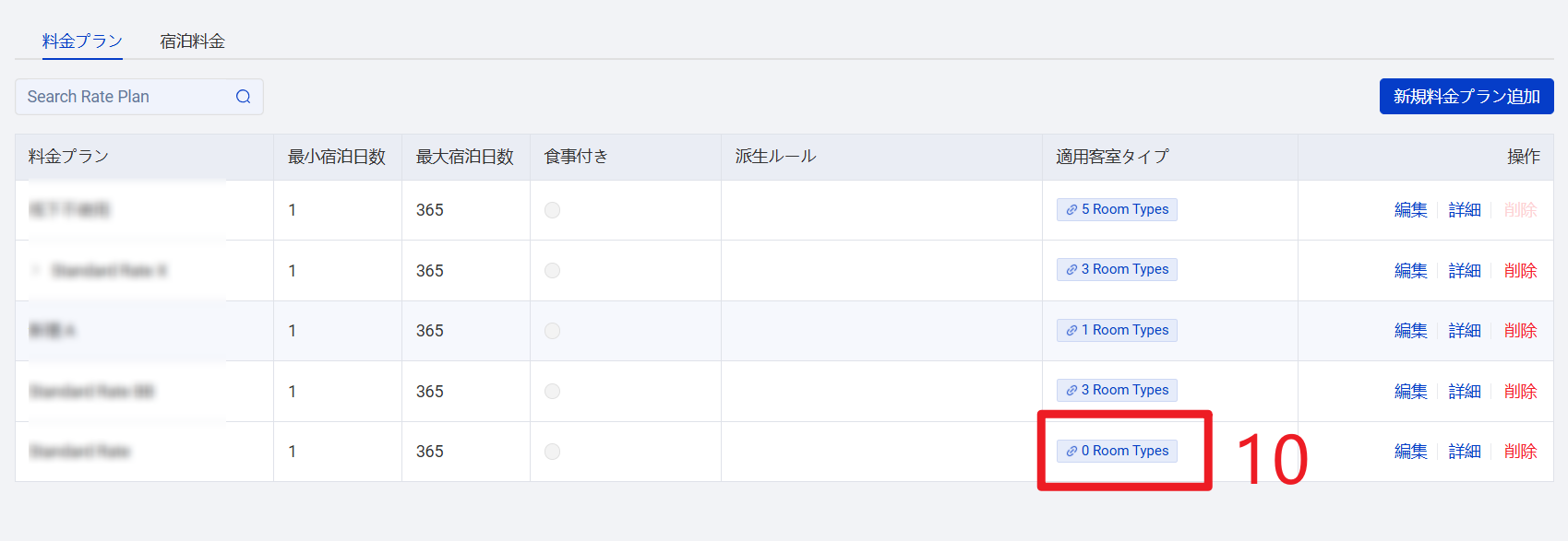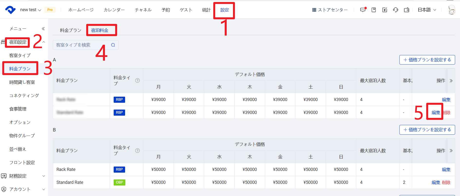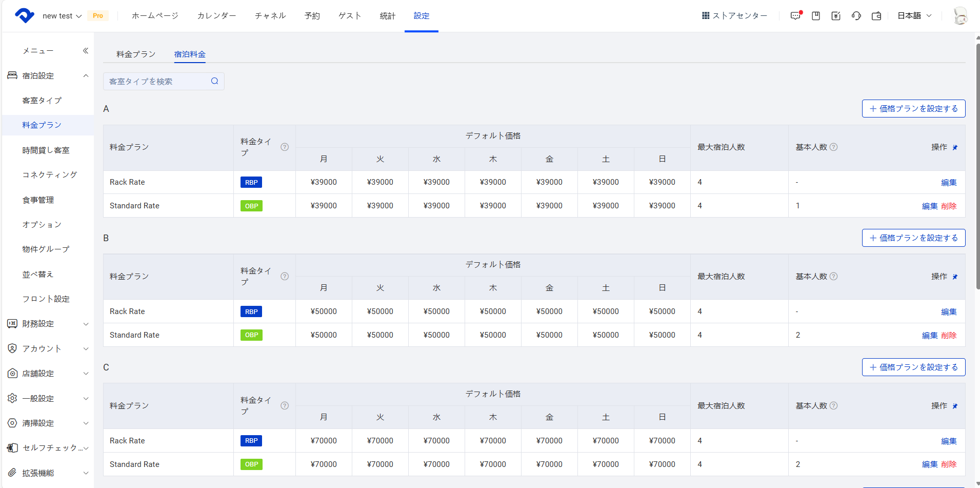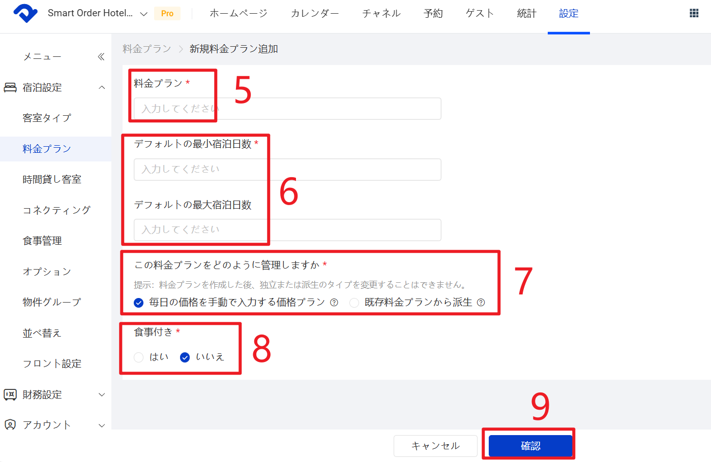 操作手順:設定 > 宿泊設定 > 料金プラン > 新規料金プランを追加