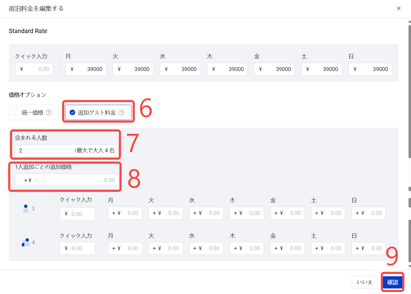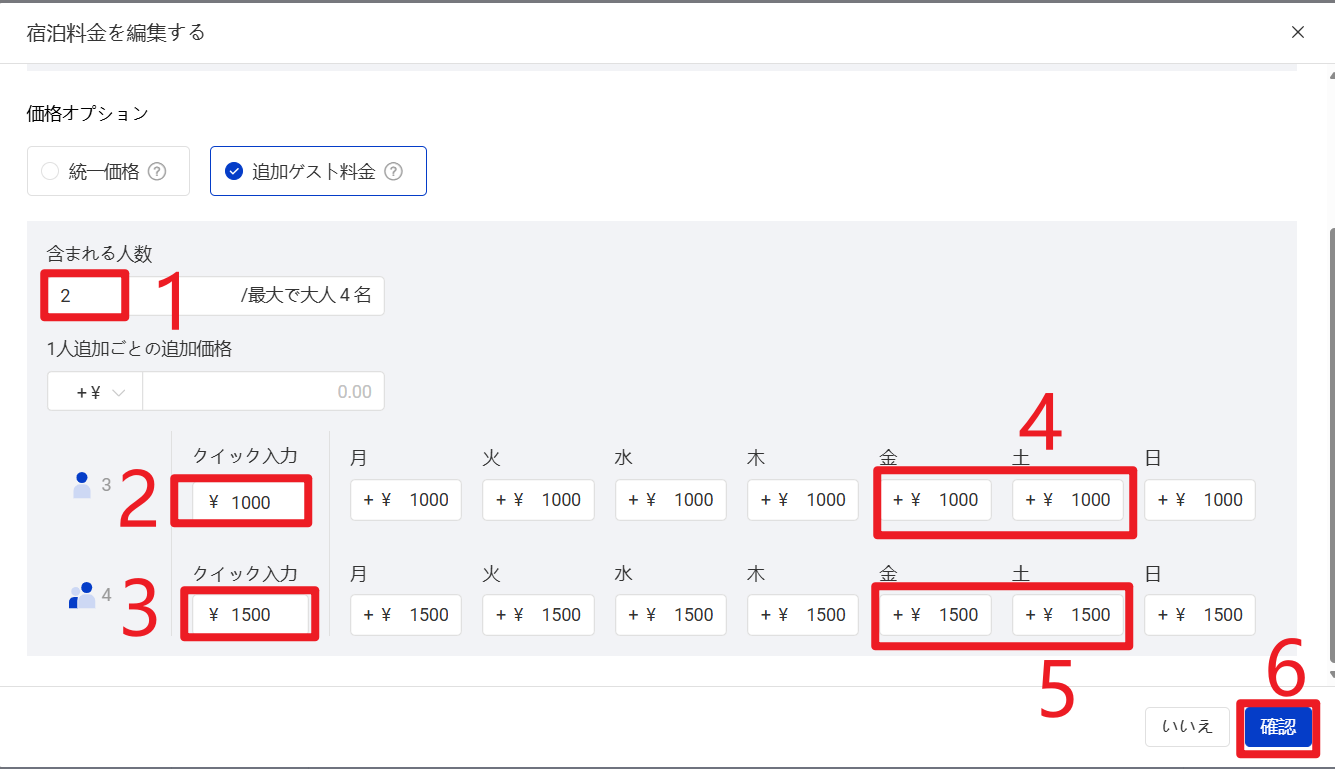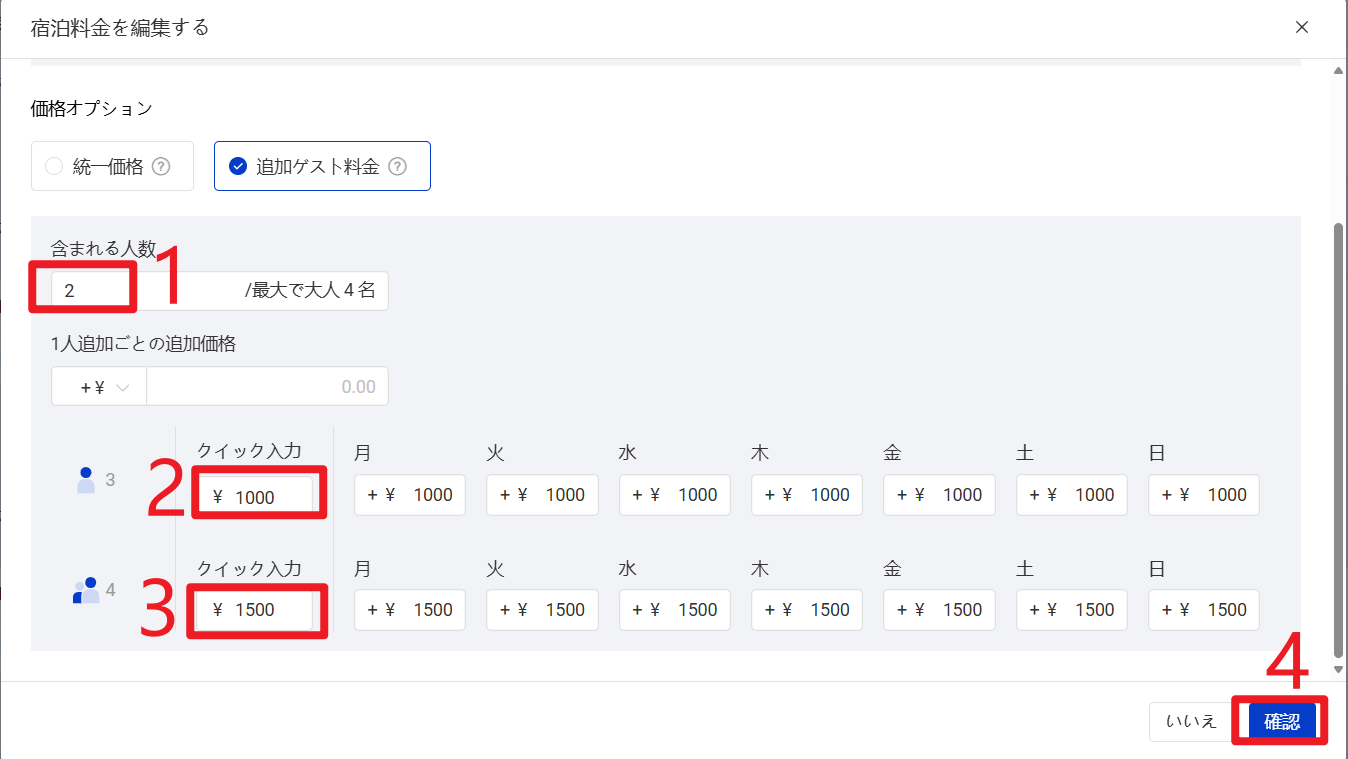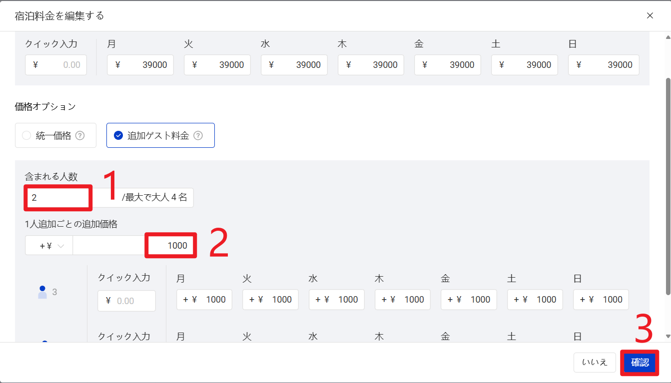 宿泊人数に応じて、追加料金を設定できます。
