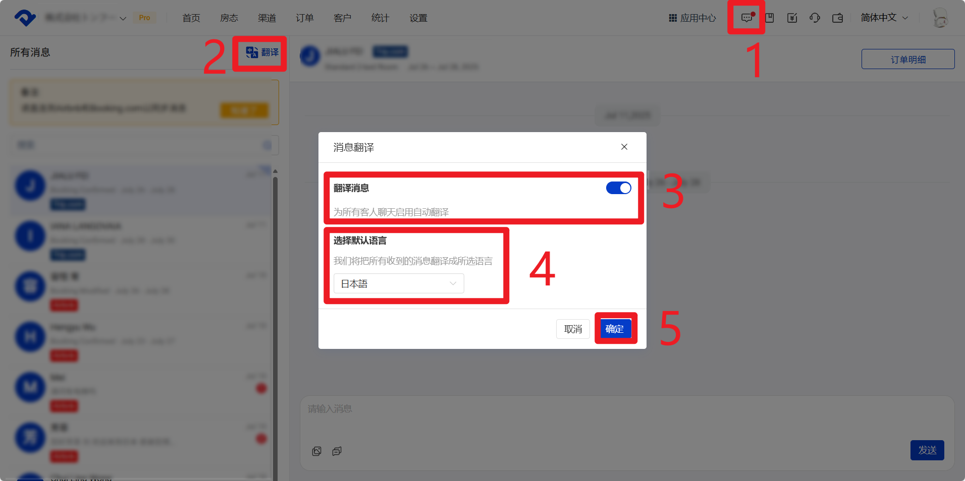 设定好目标语言后,开启自动翻译功能,系统会自动将客人发来的消息翻译成目标语言,同时显示原文与译文,方便您与来自世界各地的客人无障碍交流。