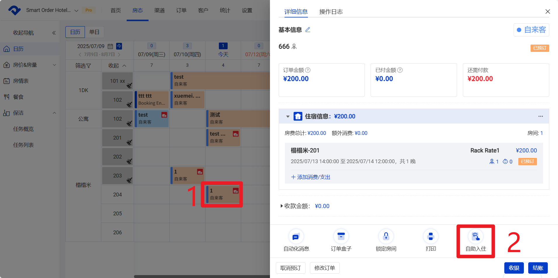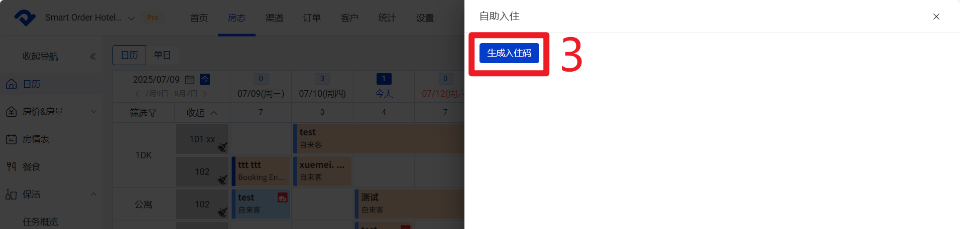 开启自助入住功能前进入PMS的订单,及部分其他特殊原因导致没有自动生成入住码和发送自助入住邮件的订单,现在可以通过点击【生成入住码】按钮手动生成入住码,使用自助入住功能。
