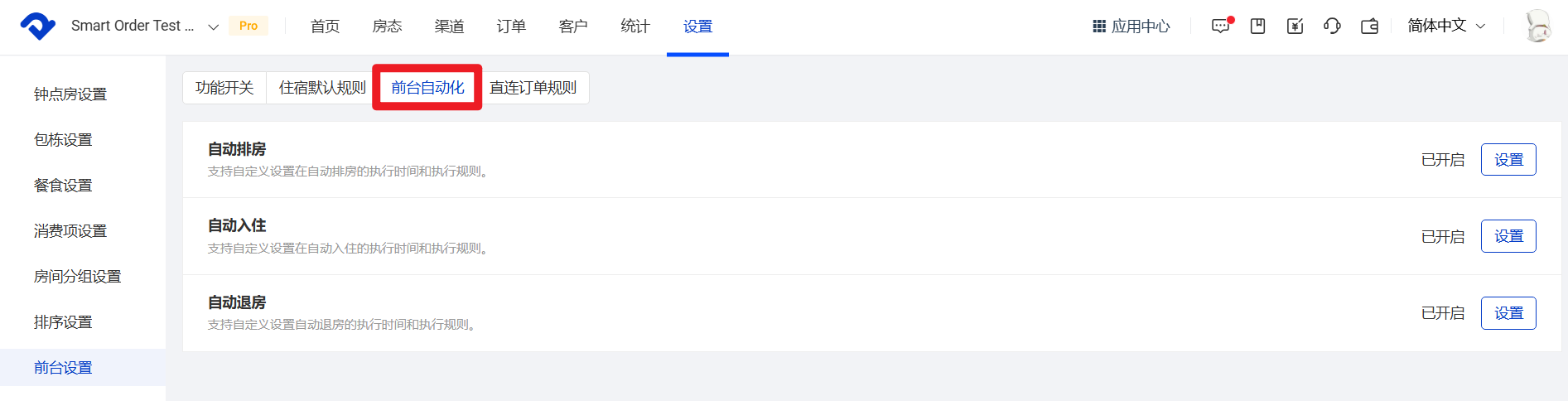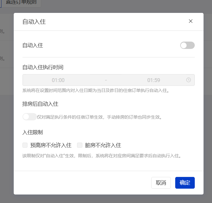 (一)、系统默认关闭该功能。开启后系统将按设置的规则对当日及昨日入住的订单自动办理入住