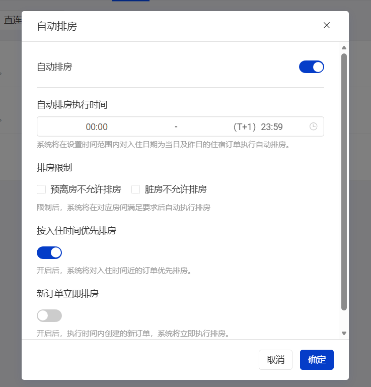 (一)、系统默认开启该功能,开启后,直连的渠道订单会自动进行排房。如果关闭,直连订单将不再自动排房,您不会在房态格子中看到渠道订单。如果希望系统自动给订单排房,建议开启该功能。