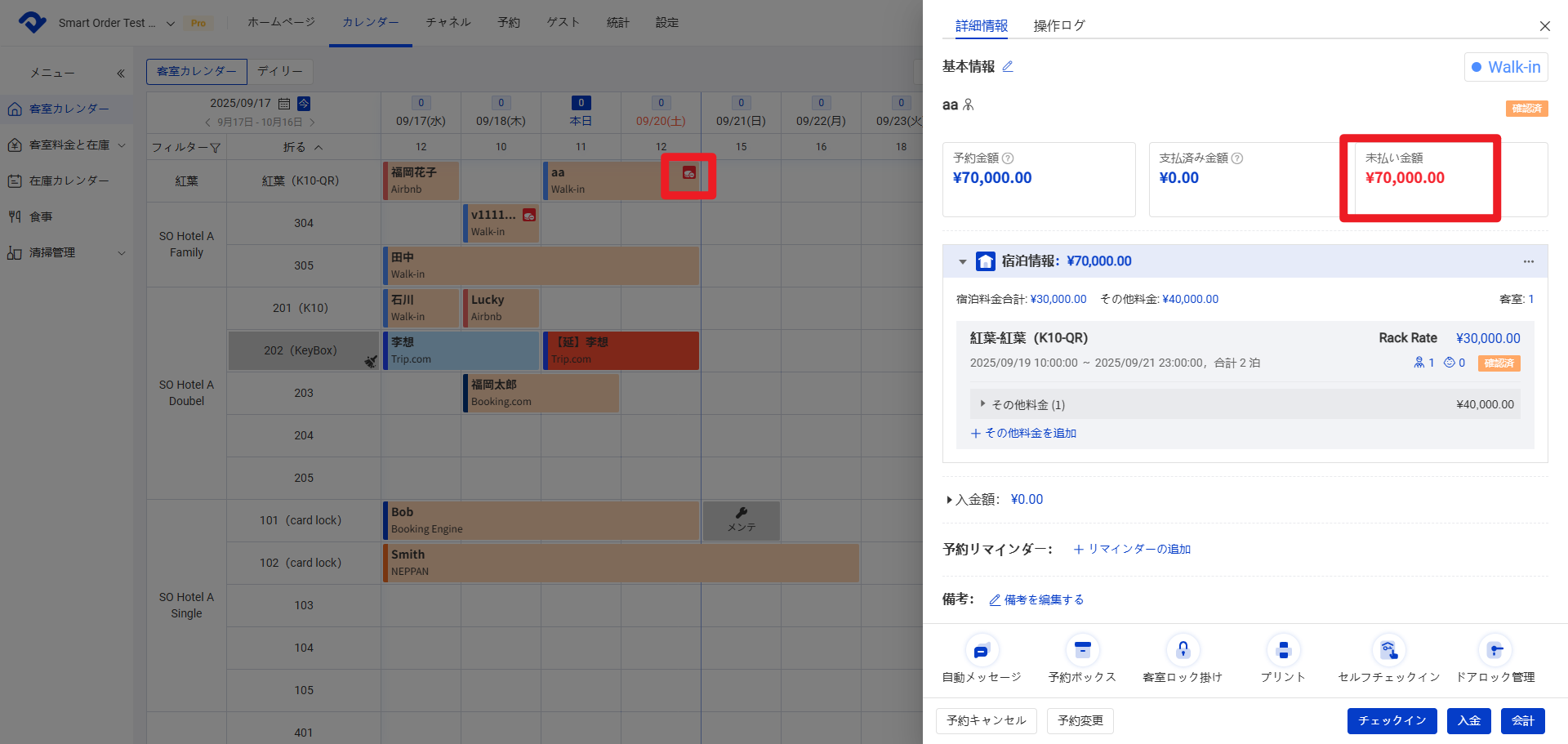 予約の右上に赤色マークが表示されている予約に対して、入金(返金)を操作すると、未払金額がゼロになり、赤色のマークもなくなります。