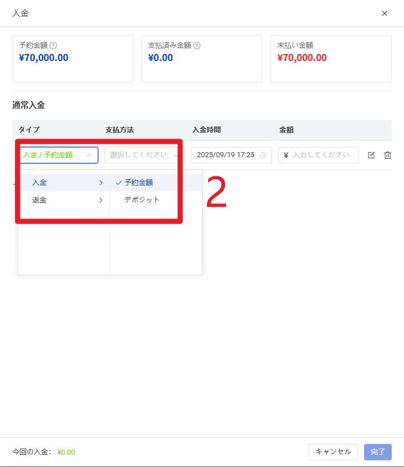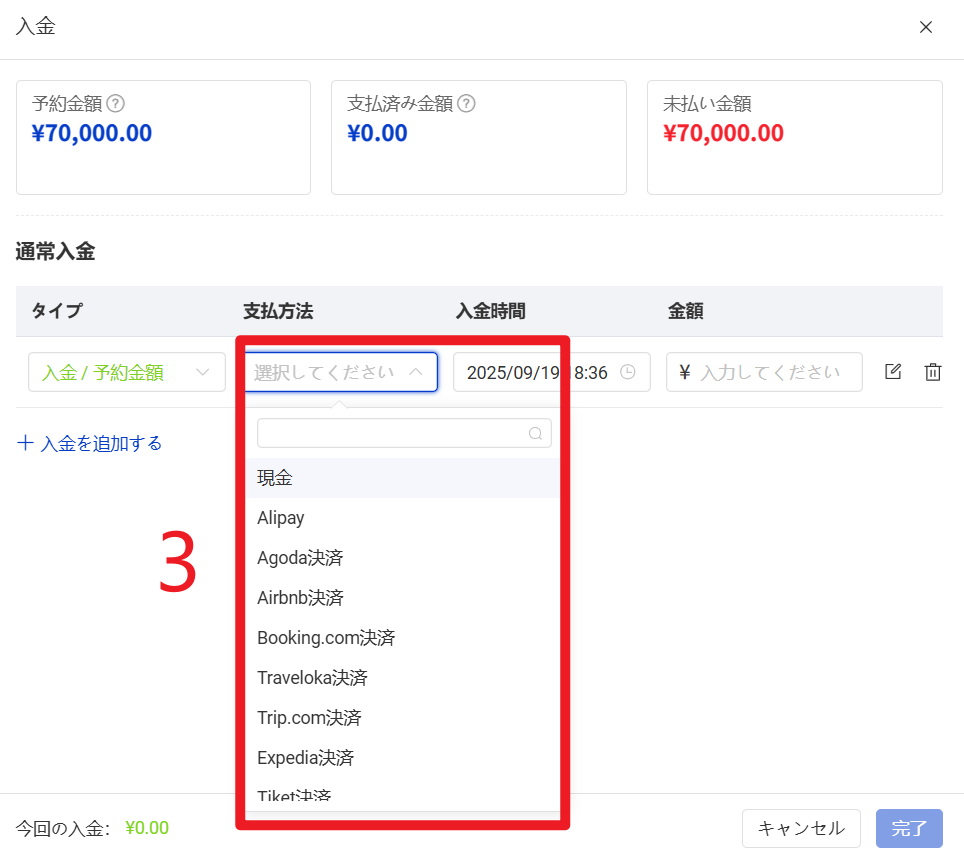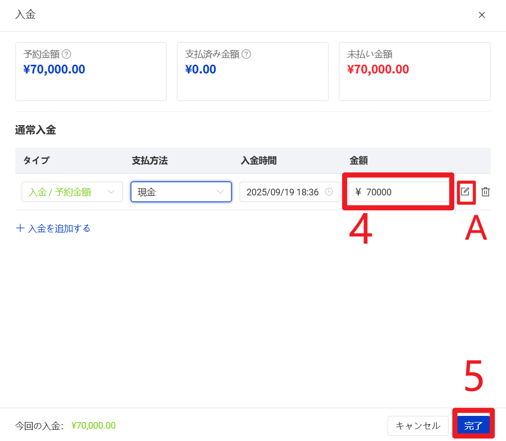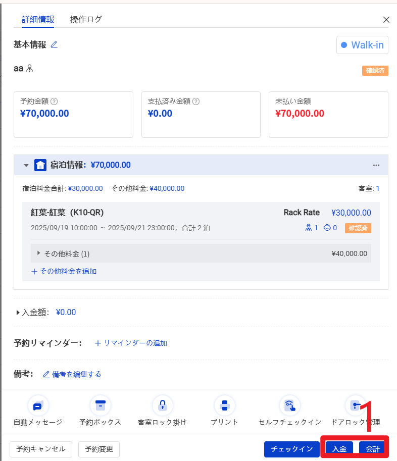 宿泊料金や追加費用の入金/返金をシステム内で記録できます。