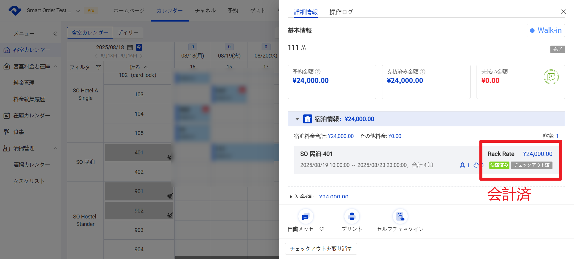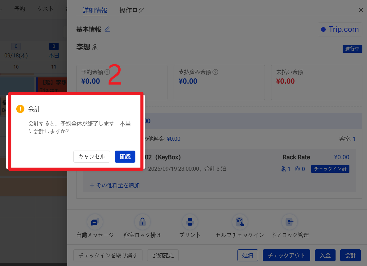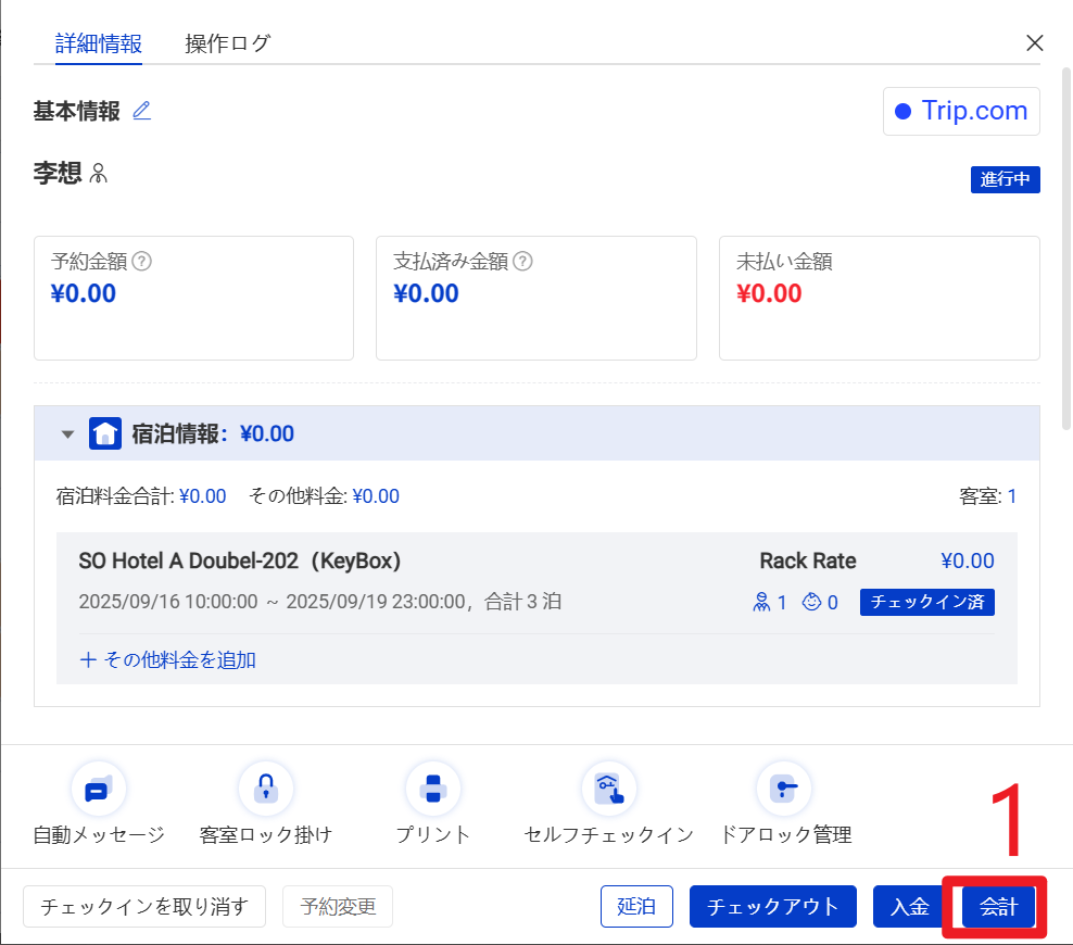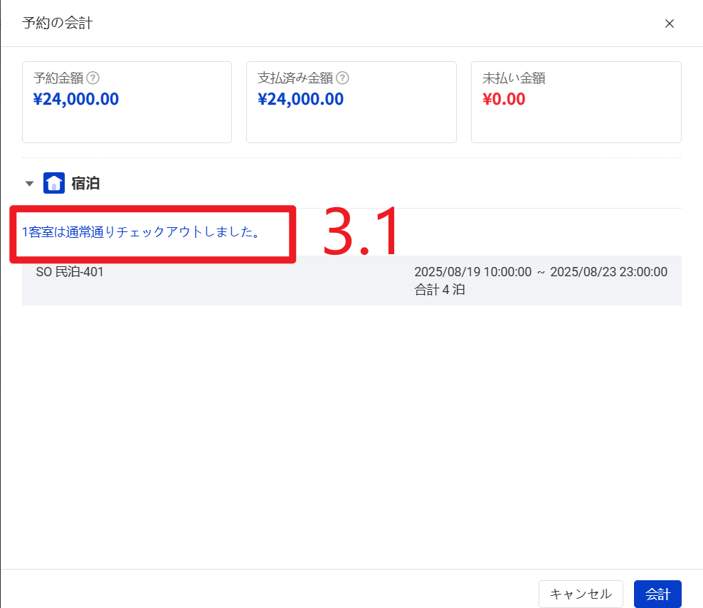 ※予約に対してチェックイン操作してから会計可能です。例えば、予約がチェックイン済み・チェックアウト済みの場合、最終金額を確認して【会計】をクリックし、予約を終了します。