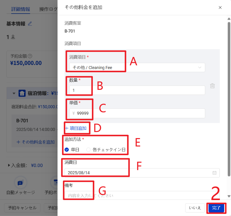 E. 添加方式:1回のみの消費の場合は【単一の日付】を選択。滞在期間中毎日徴収する場合は【滞在中の毎日】を選択