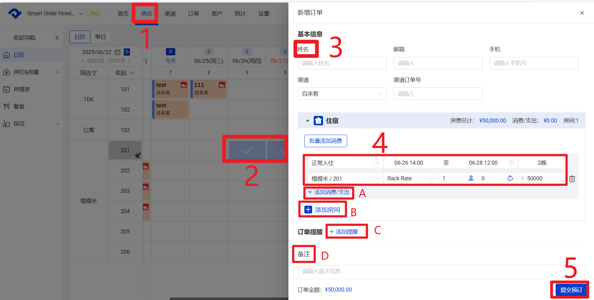 操作路径:房态-对应日期与房间号-新预定-提交订单