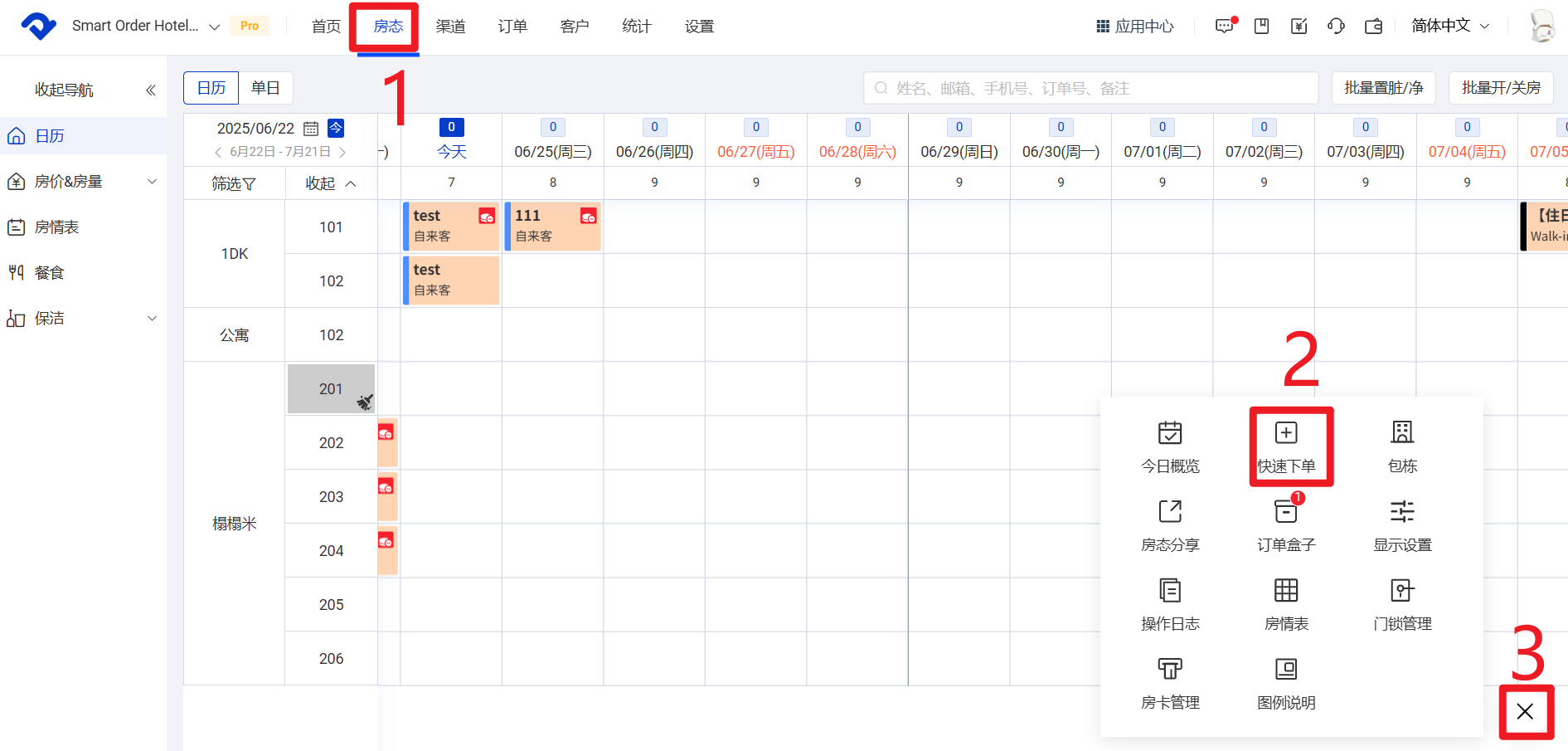 操作路径:房态-右下角的"+"号-新预定-添加房间-入住日期-间夜数-房间号-提交订单