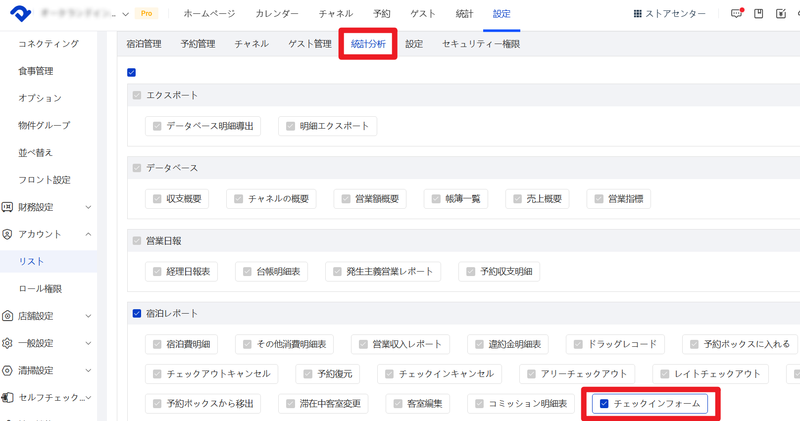 - 本機能を利用するアカウントに【チェックインフォーム】の権限を付与します。