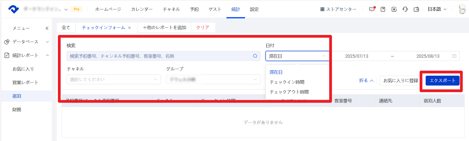 - システム上部メニューの【統計】-【統計レポート】-【宿泊】ページへ移動します。