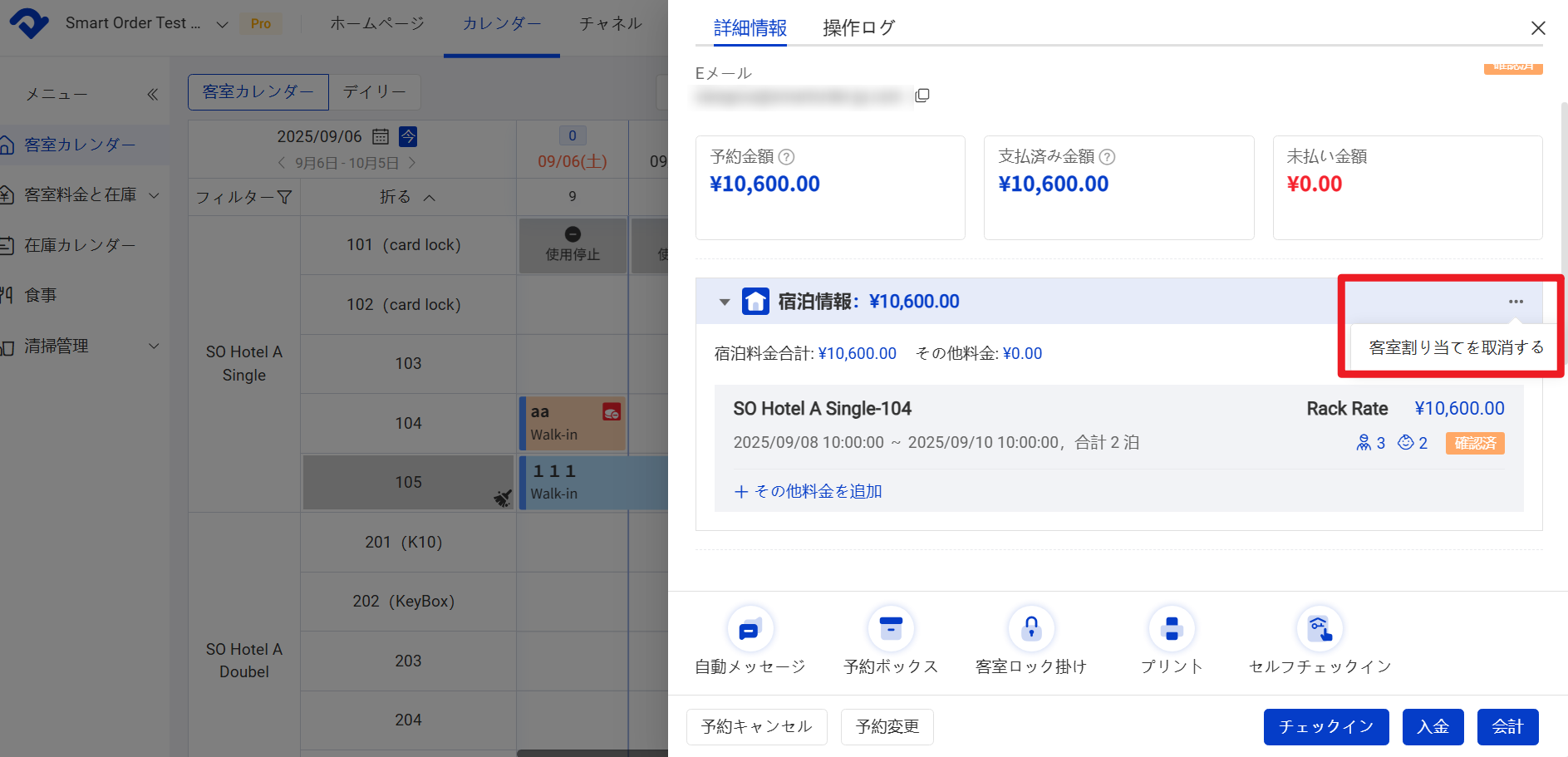 予約画面 → 【宿泊情報】欄右端【...】 → 【客室割り当てを取消する】