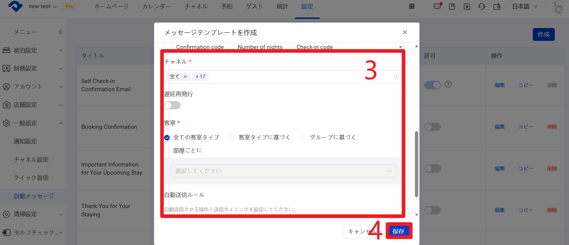 客室未手配の予約には自動メッセージが送信されません。 部屋を手配した後、ルールで指定された送信タイミングを過ぎていなければ、設定された時刻に通常どおり送信されます。