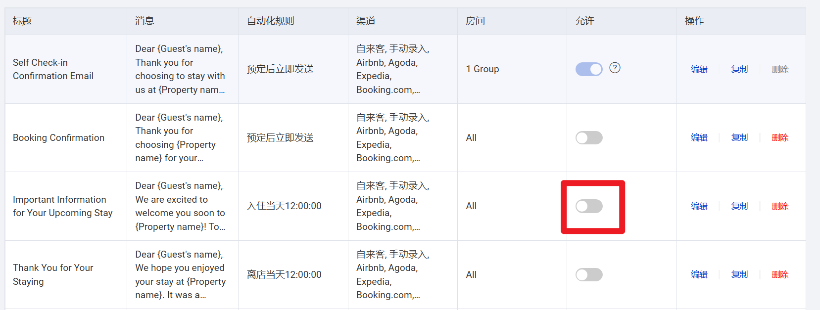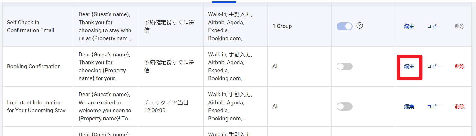 自動メッセージには4つの初期テンプレートがあり、そのうち1つ目の 【Self Check-in Confirmation Email】 はセルフチェックイン専用のテンプレートです。編集は可能ですが削除はできません。自助チェックイン機能を有効にしている場合、このテンプレートは自動的にONとなり、設定された内容・ルールに基づき、ゲストへセルフチェックイン案内が送信されます。