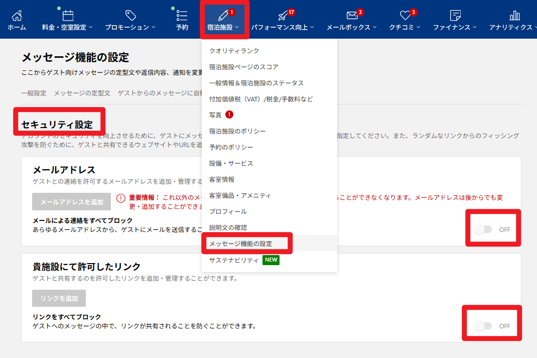 自動化メッセージまたは自助チェックイン機能を利用して、Booking.comのゲストへメッセージを送信する場合、Booking.com管理画面>「宿泊施設」>「メッセージ設定」>「セキュリティ設定」内で、メール・リンクの制限を設定しないでください。制限が設定されていると、システムからのメールがゲストへ届かなくなる可能性があります。