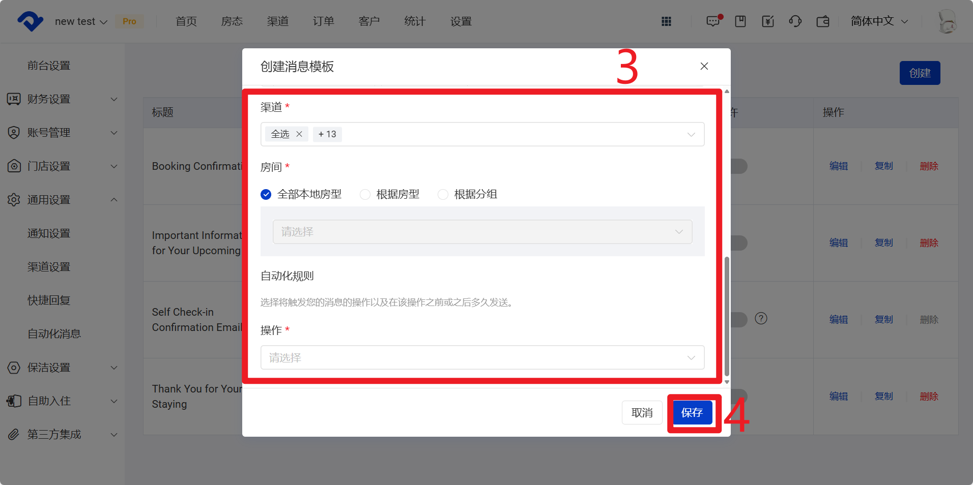 分为【预订确认】、【入住】和【离店】三种类型,选择后可以继续选择具体的发送时间(例如预订确认后立即发送、入住前一天18:00发送等)