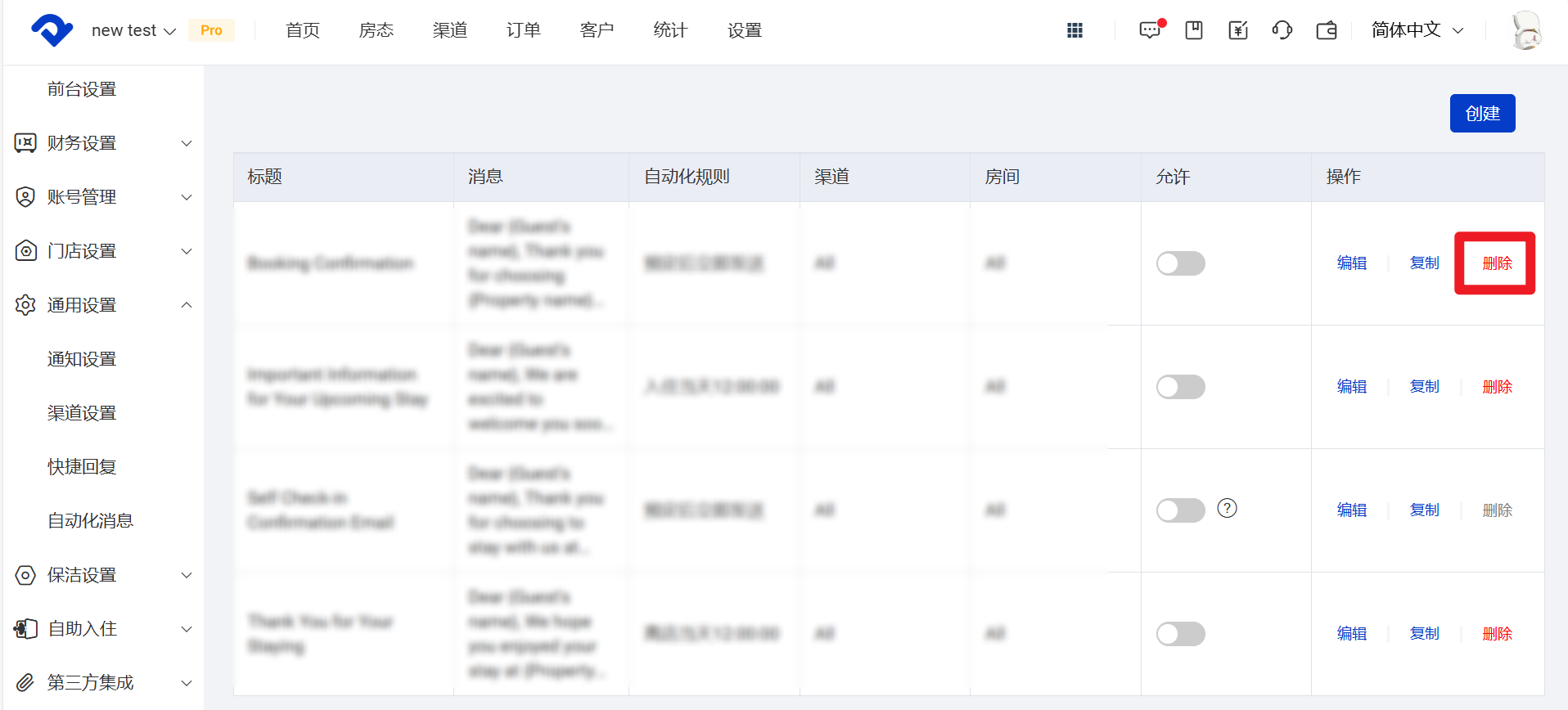1.系统中存在四个初始自动化消息模板,其中第三个【Self Check-in Confirmation Email】为自助入住消息模板,可以编辑但不可删除。 此模板与系统的自助入住功能联动,在启用自助入住功能的前提下,【Self Check-in Confirmation Email】会强制开启,系统将按照该模板设定好的内容和规则自动将自定义的自助入住消息发送给客人。