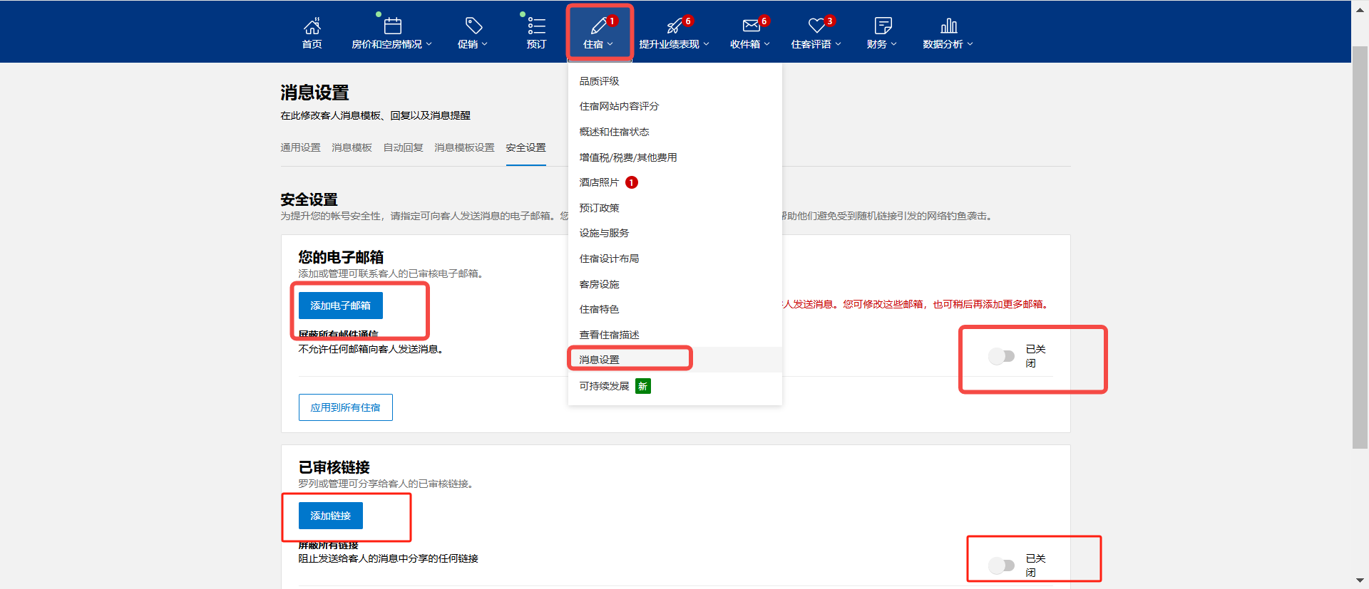 4.如需使用自动消息或自助入住功能给通过Booking.com预订的客人发送消息,请不要在Booking.com后台【住宿】-【消息设置】-【安全设置】处设置对邮箱和链接的限制。