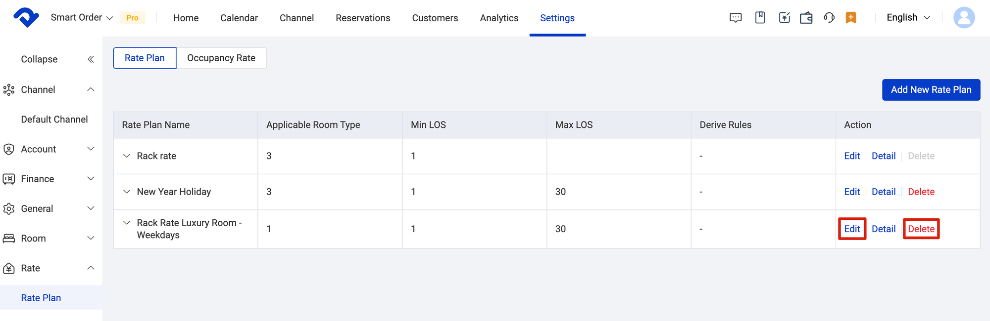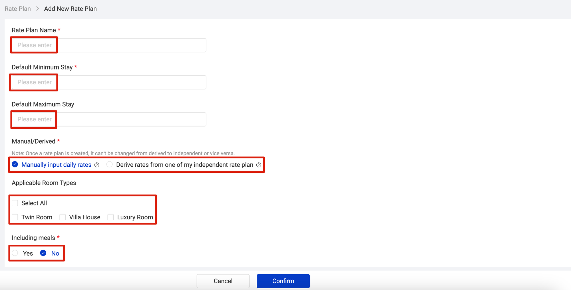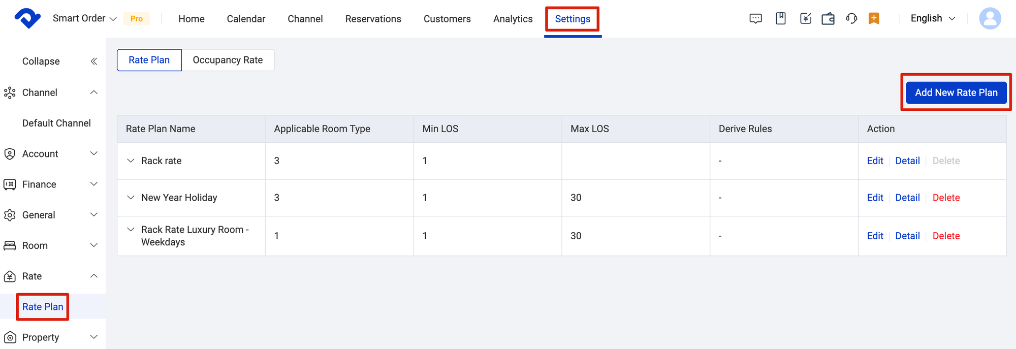 Click on Settings > Rate Plan > Click Add New Rate Plan > Type in the Rate Plan Name > Set Default Minimum Stay > Set Default Maximum Stay > Choose Manual/Derived > Select Room Types > Choose whether to incluede meals > And then save