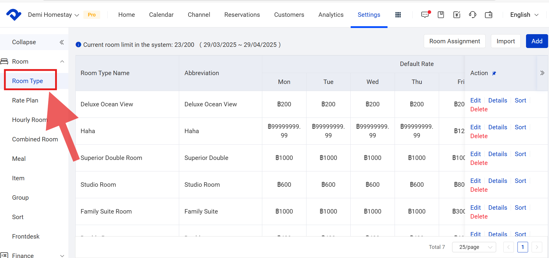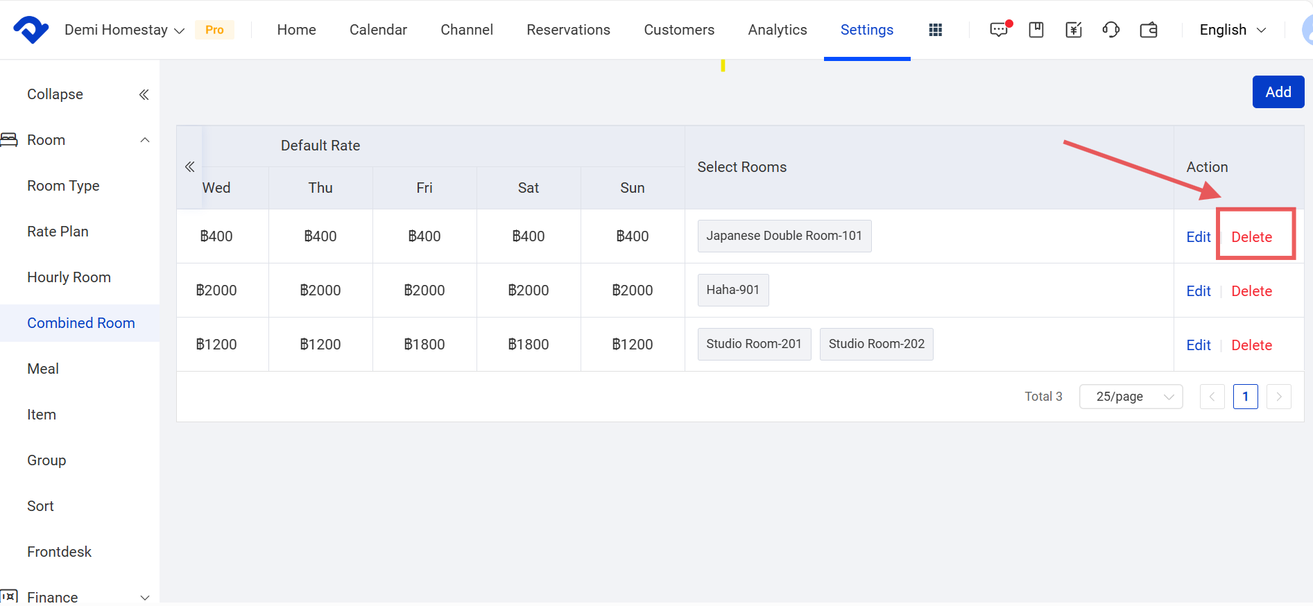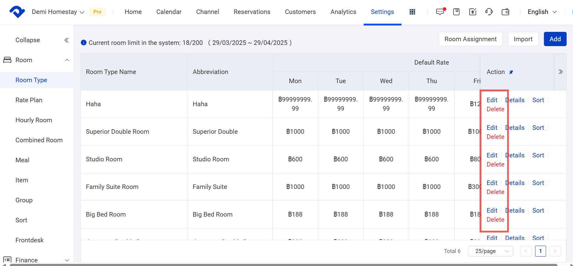 Step2: Choose the room type you want to delete and click Delete from the Action button.