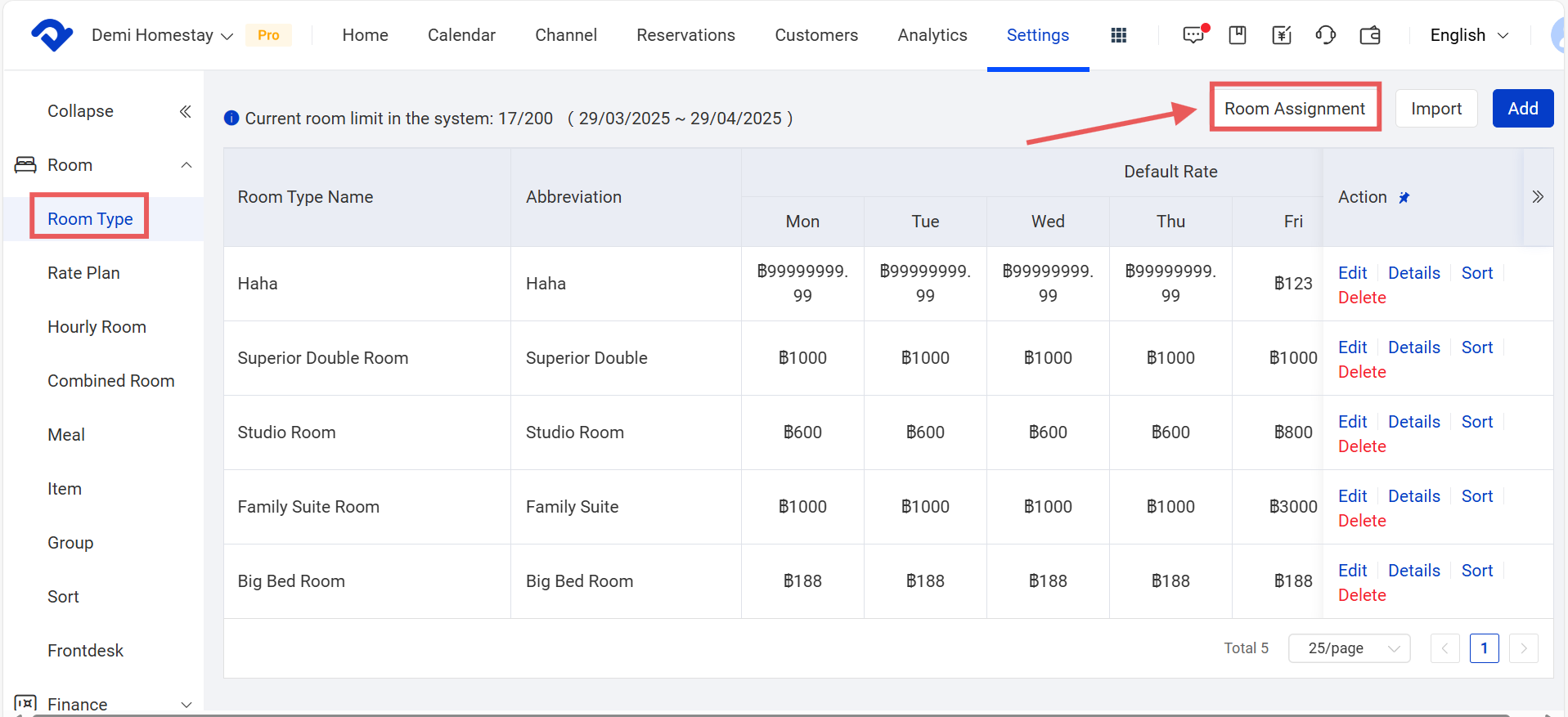 step1: Go to the Settings page. Select Room Type from the Room drop-down list. Click Room Assignment.