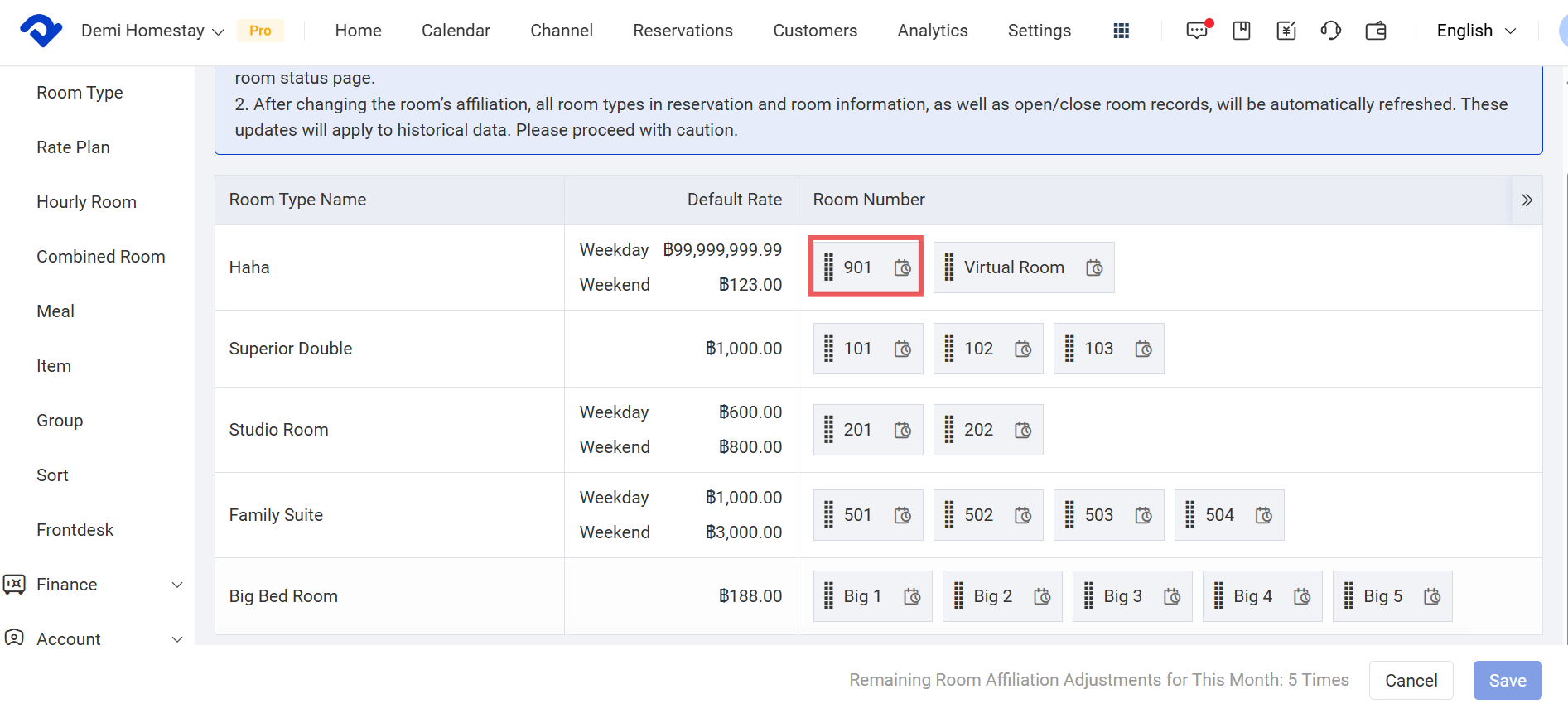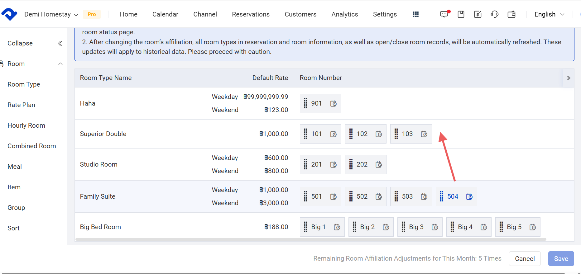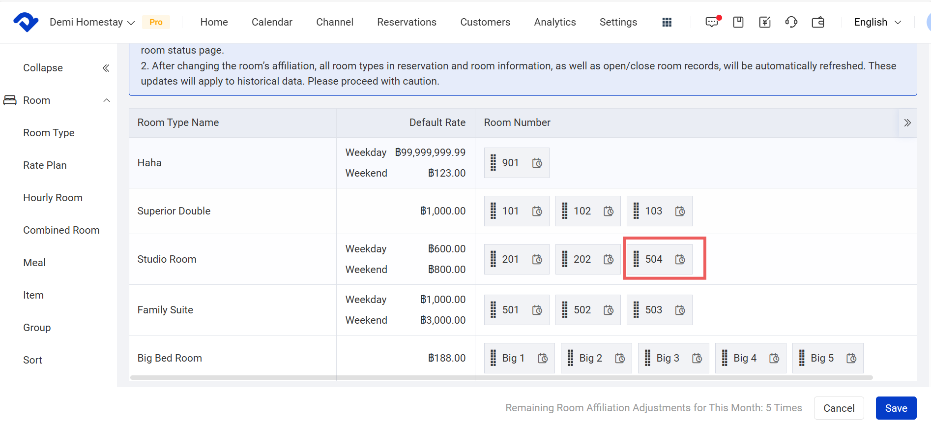 - There must be at least one room under a room type. If you need to change a room assignment, you need to add a new room under this room type. Otherwise, this room type will be deleted.
