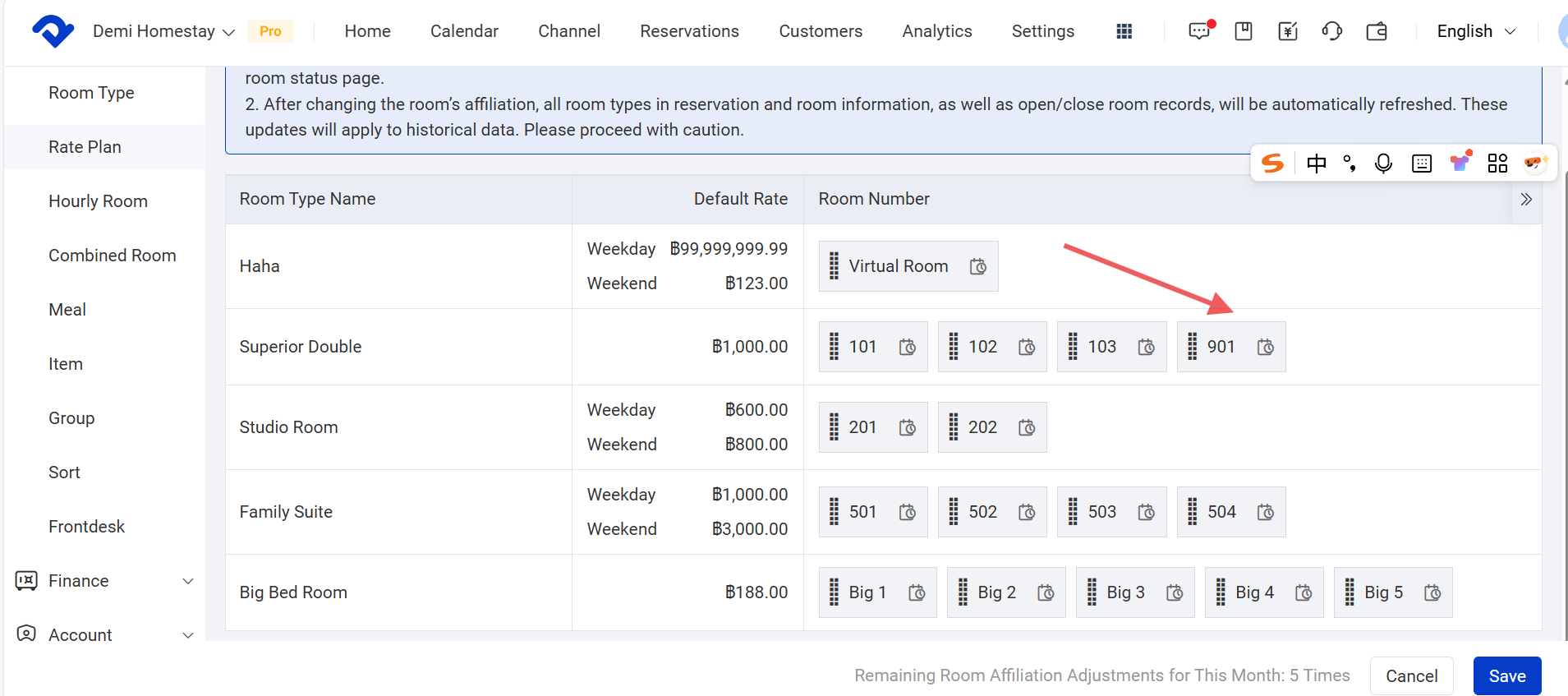 - If there is a notice saying that this room type has been connected to an OTA channel, you need to disconnect the channel first. And then you can continue with the room assignment. After you finish changing the room assignment, you need to reconnect the room type with the channel so that the OTA orders won't be overbooked or logged off.